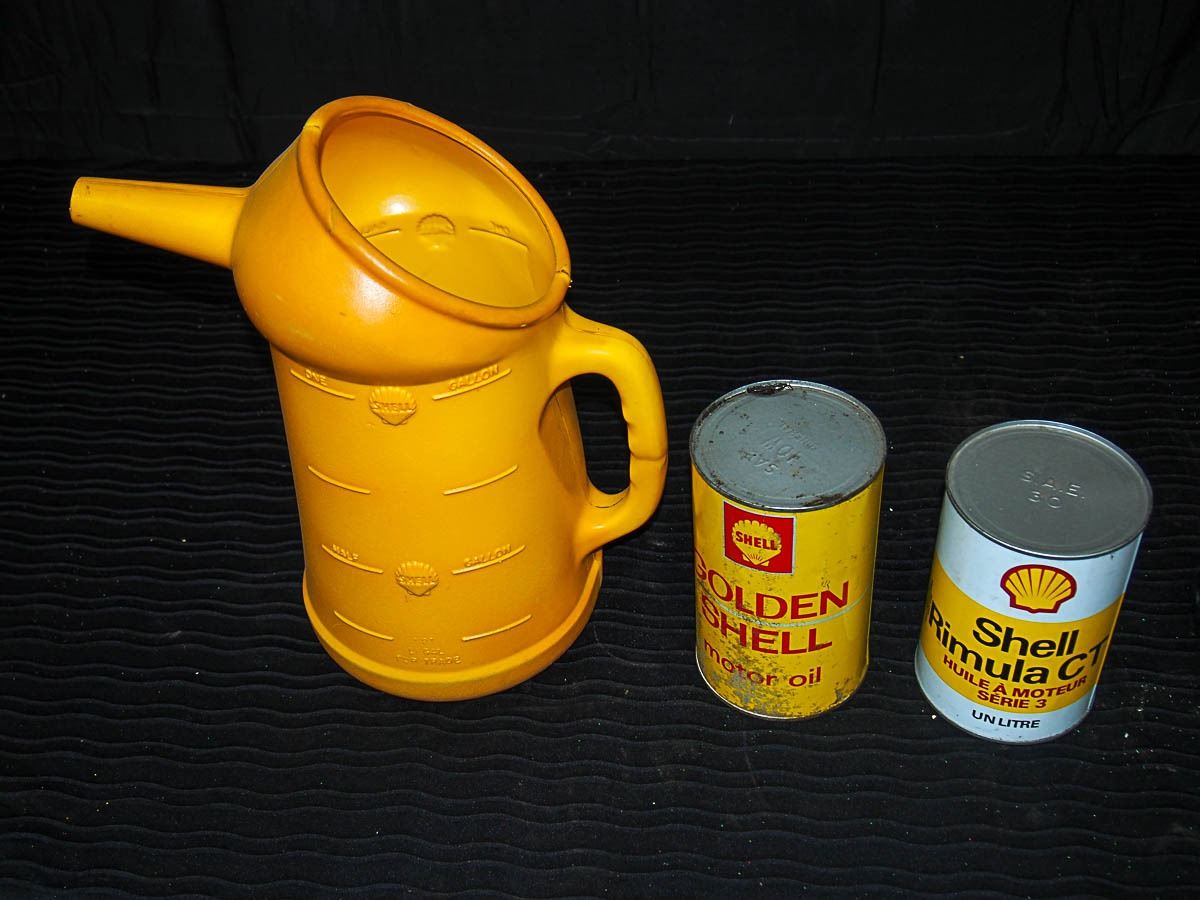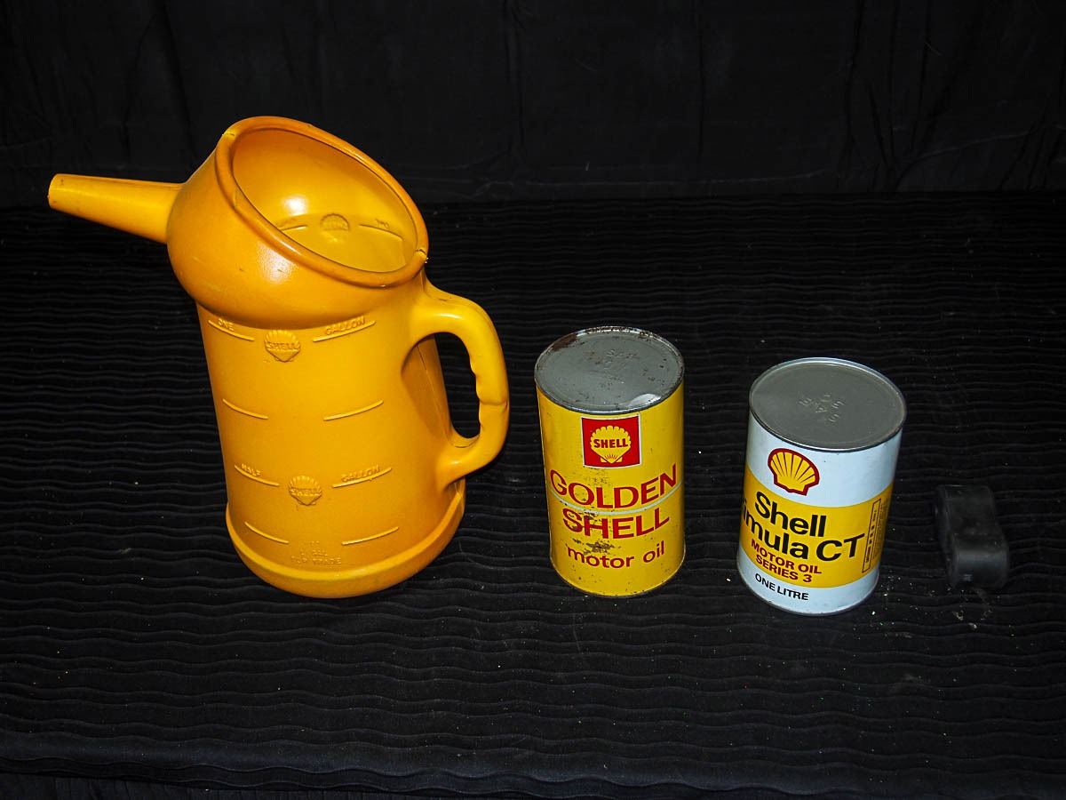 (2) Shell Tins (Rimula with Contents) & Plastic Shell Oil Pourer