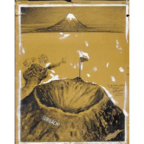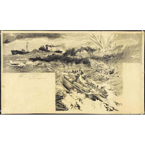 <B>Two Fine Signed World War II Cartoons by</B></I> <I>Los Angeles Times</B></I> <B>Artists Charles H. Owens and Bruce Russell.</B></I> The Owens (21" x 13"), dated July 2, 1943 and inscribed: <I>"To my friend D. Ransome,"</B></I> depicts U.S. PT boats attacking an enemy warship. The Russell (15" x 22"), dated 10/19/45, is also inscribed to Ransome, and shows the U.S. flag atop Mt. Suribachi. This was the quality of work that would earn Russell the Pulitzer Prize in 1946. Both excellent condition except for one edge tear on the Russell. Poignant images of this terrible era in our history.