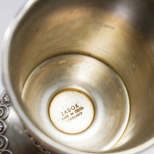 1 stamped 84 with etched scenic design. 1 etched floral becher from Israel stamped sterling, decorated with stones. Approx. 4.66 ozt.