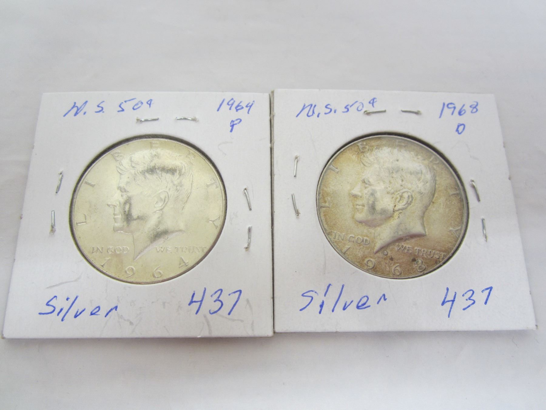 2 Silver Kennedy 1964 and 1968 Fifty Cent Pieces