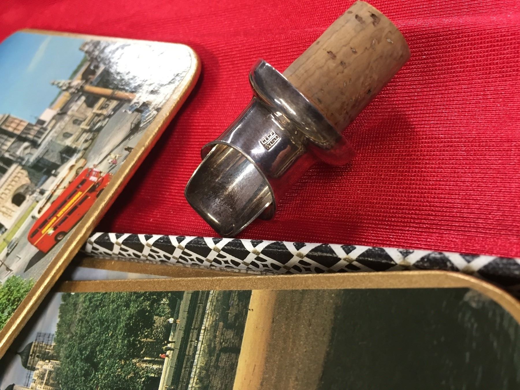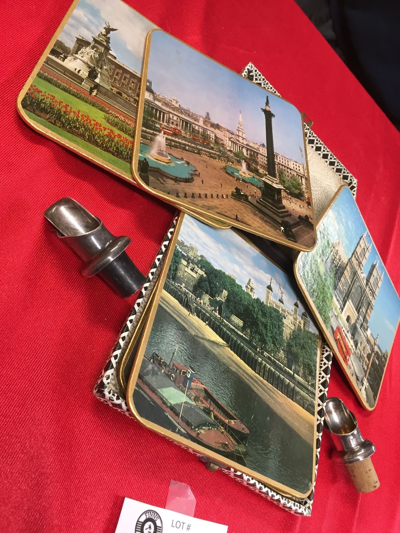 2 Silver Plated Vottle Stop Drink Pourers. Plus a Box of English Hotplate Coasters