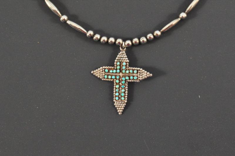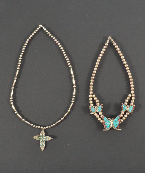 Butterfly Design with Turquoise and Coral Inlay (approx. 18" L) and Silver and Turquoise Cross Necklace (approx 25" L).