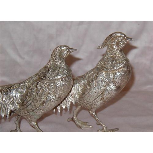 <table width="100%" border="0" cellspacing="0" cellpadding="4"><tr><td><em> </em></td></tr><tr> <td width="100%"> 2 beautiful - one male, one female - birds - probably pheasants in silverplate. They have long tails. Pictures do not show the brightness of the silver. Signed Italy and mark I cannot understand. Buyer pays shipping and handling costs. </td></tr><tr> <td> </td></tr><tr> <td>Reference #: B327_1319</td></tr><tr><td>Condition:good</td></tr><tr><td>Year:1930's</td></tr><tr><td>Country:Italy</td></tr><tr><td>Height:5</td></tr><tr><td>Width:10</td></tr><tr><td>Title:2 Silverplate Birds with Lovely detail</td></tr><tr><td>Location:Hanover, Maryland</td></tr></table>