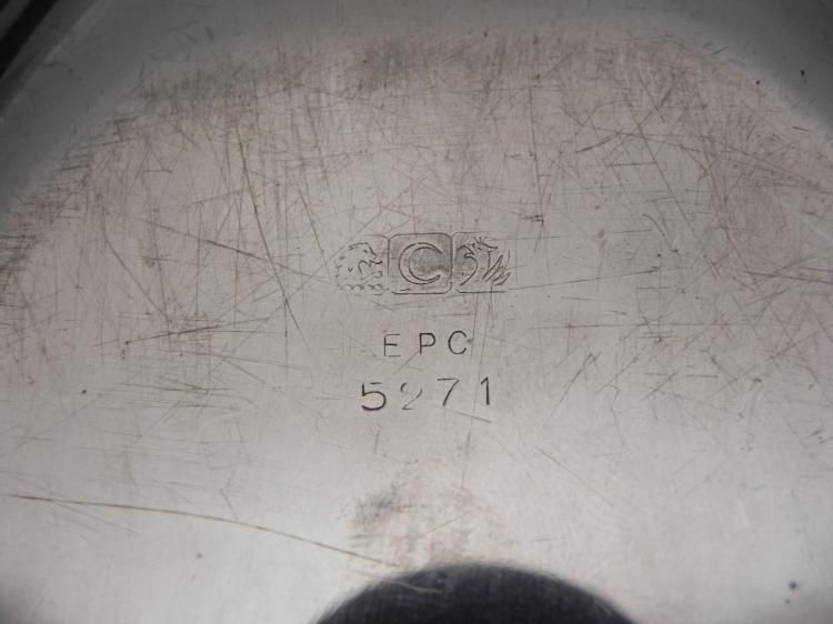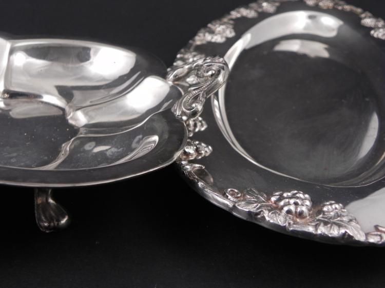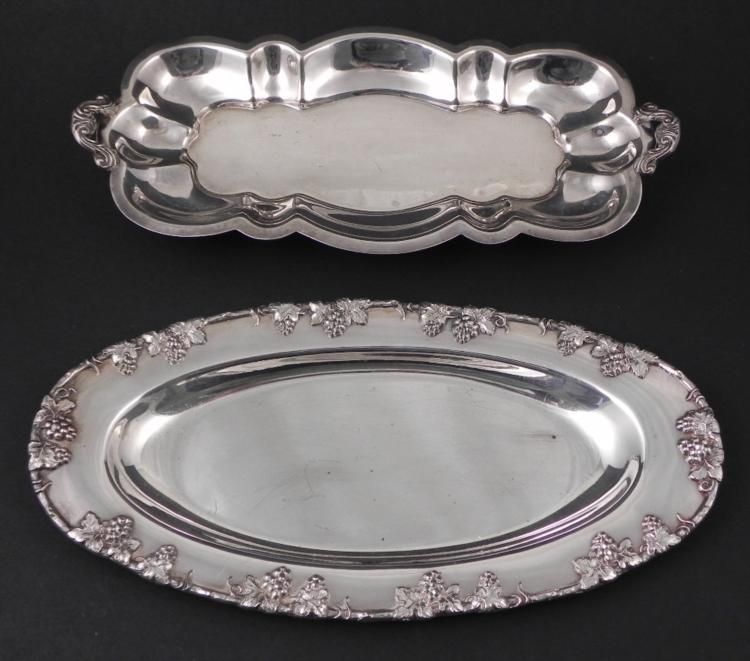 These are two silverplated serving platters in elongated shapes. One is oval with grape leave pattern in relief around the edge. It is hallmarked, along with EPC 5271. The size is 7 x 14 inches. The other is ia fanciful shape, with decorative handles and feet. It is unmarked, and the size is 6 x 13 1/2 inches. Each distinct platter is in very good condition, with minimal wear.