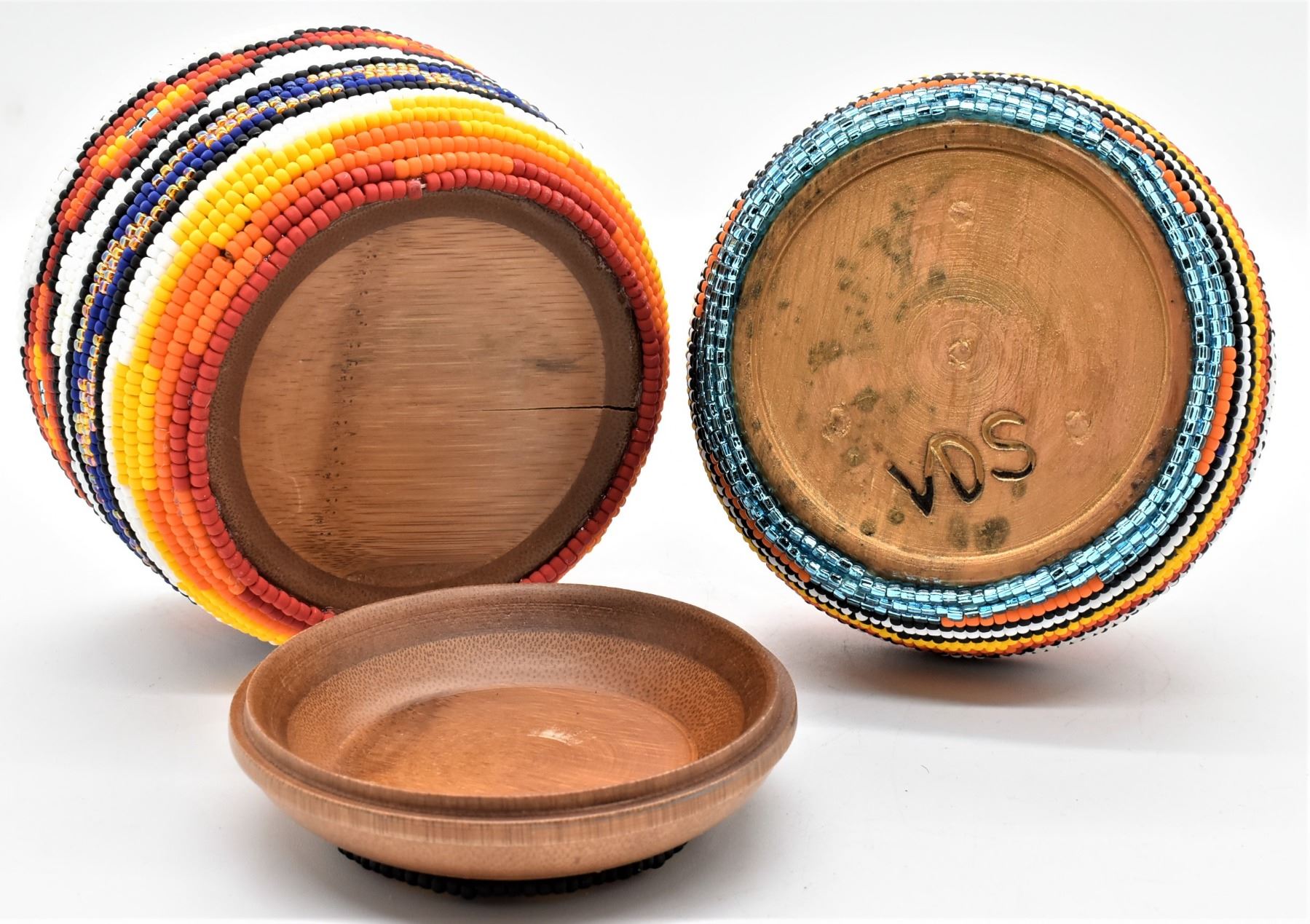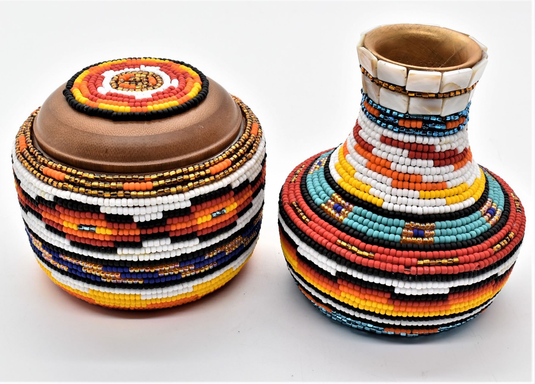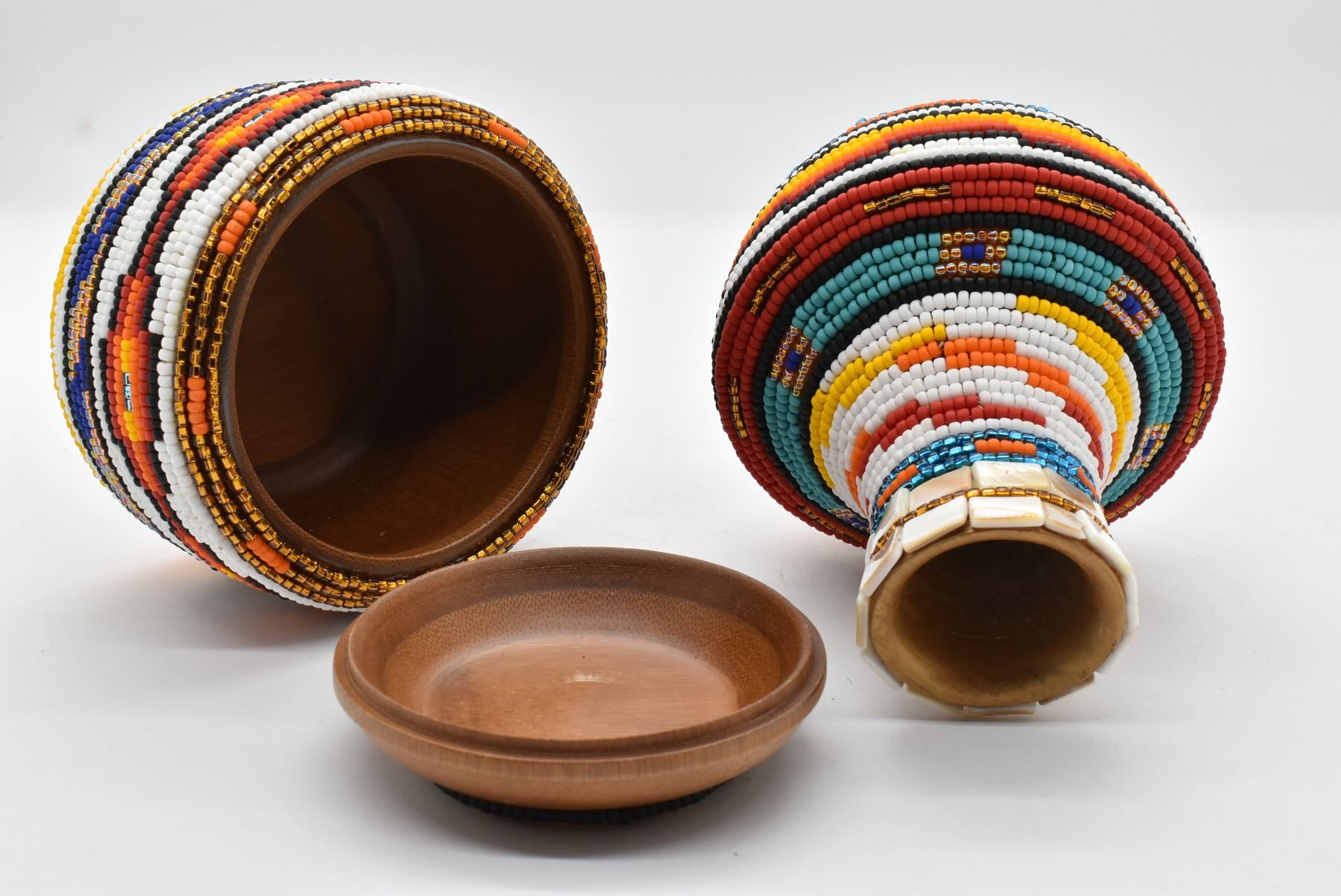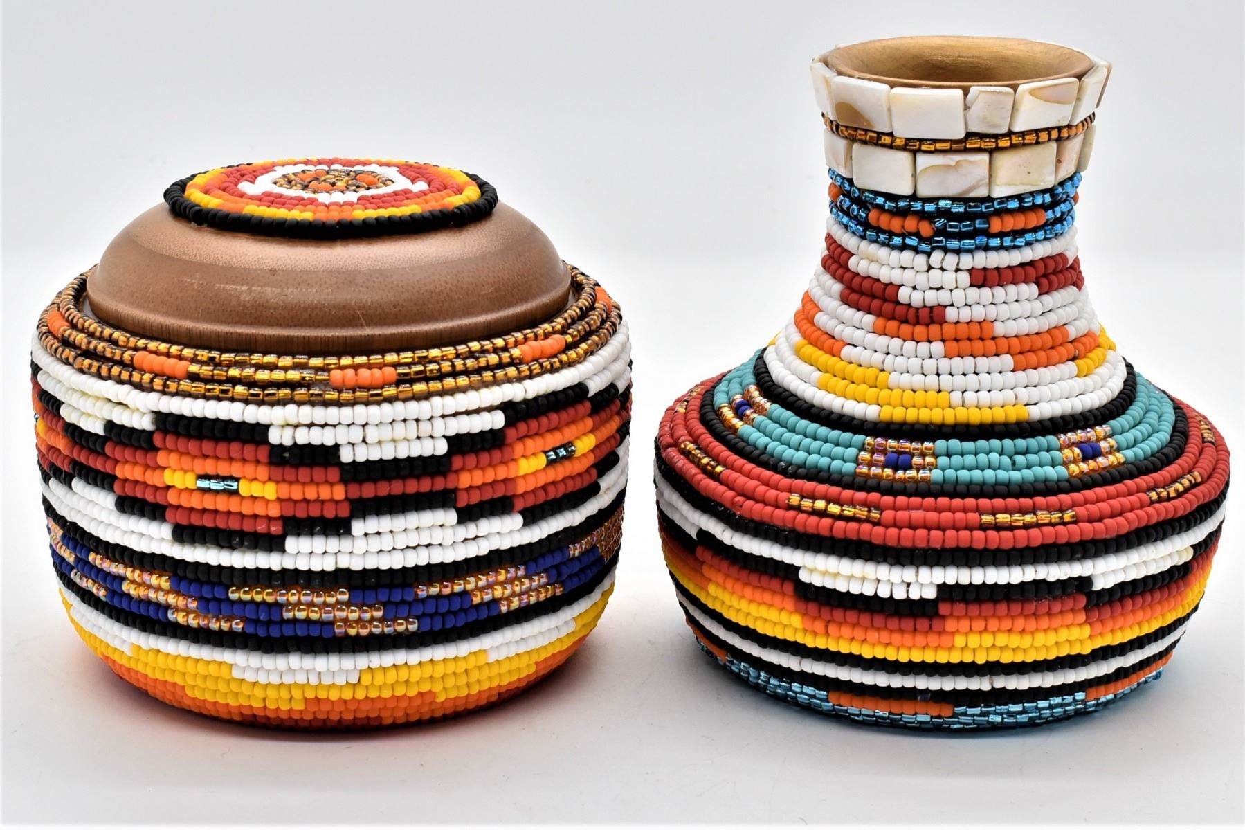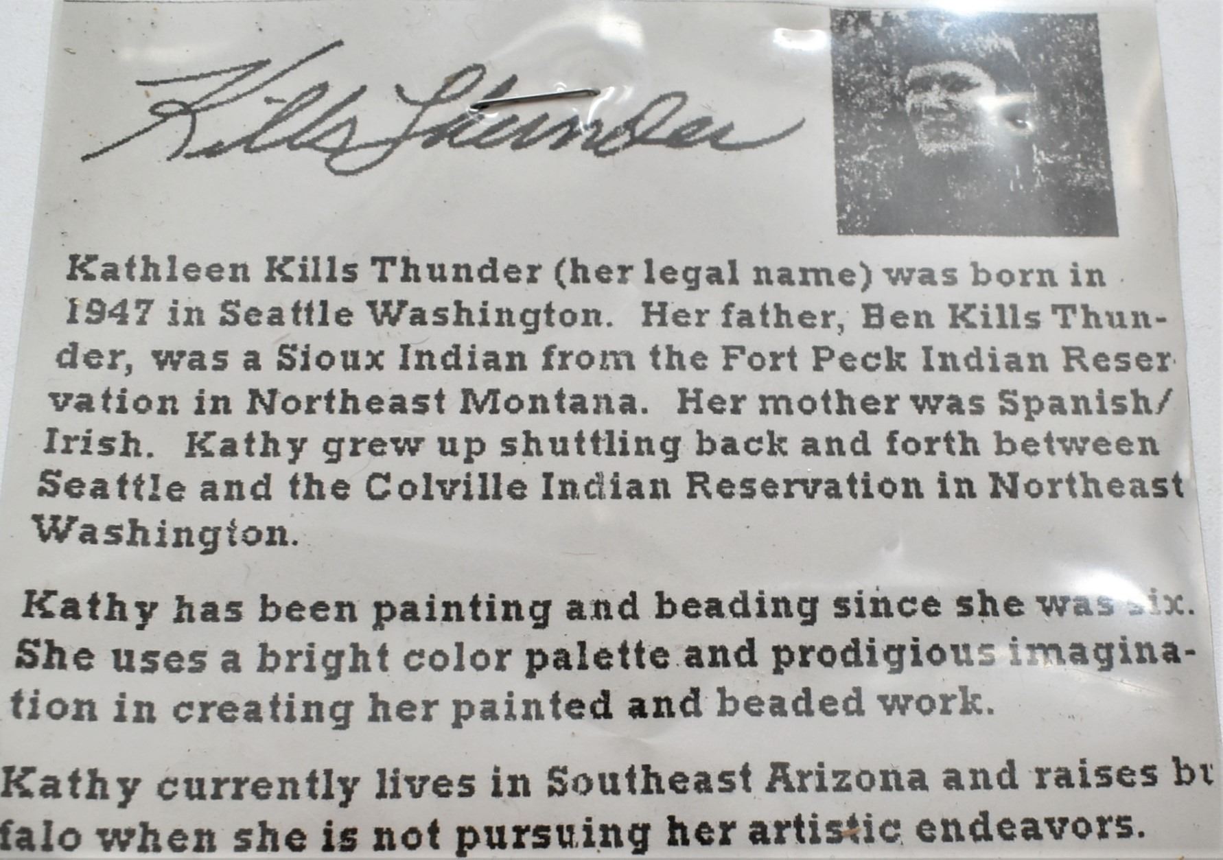 2 Native American Sioux Hand Beaded Composition Collectibles by Kathy Kills Thunder, lidded trinket box measures 4.5'' x 6'', vase measures 5.75''H x 5.25''D, beautifully beaded, Artist Bio: Kathleen Kills Thunder (her legal name) was born in 1947 in Seattle, WA. Her father, Ben Kills Thunder, was a Sioux Indian from the Fort Peck Indian Reservation in NE Montana and her mother was Spanish/Irish. Kathy has been painting and beading since she was six.