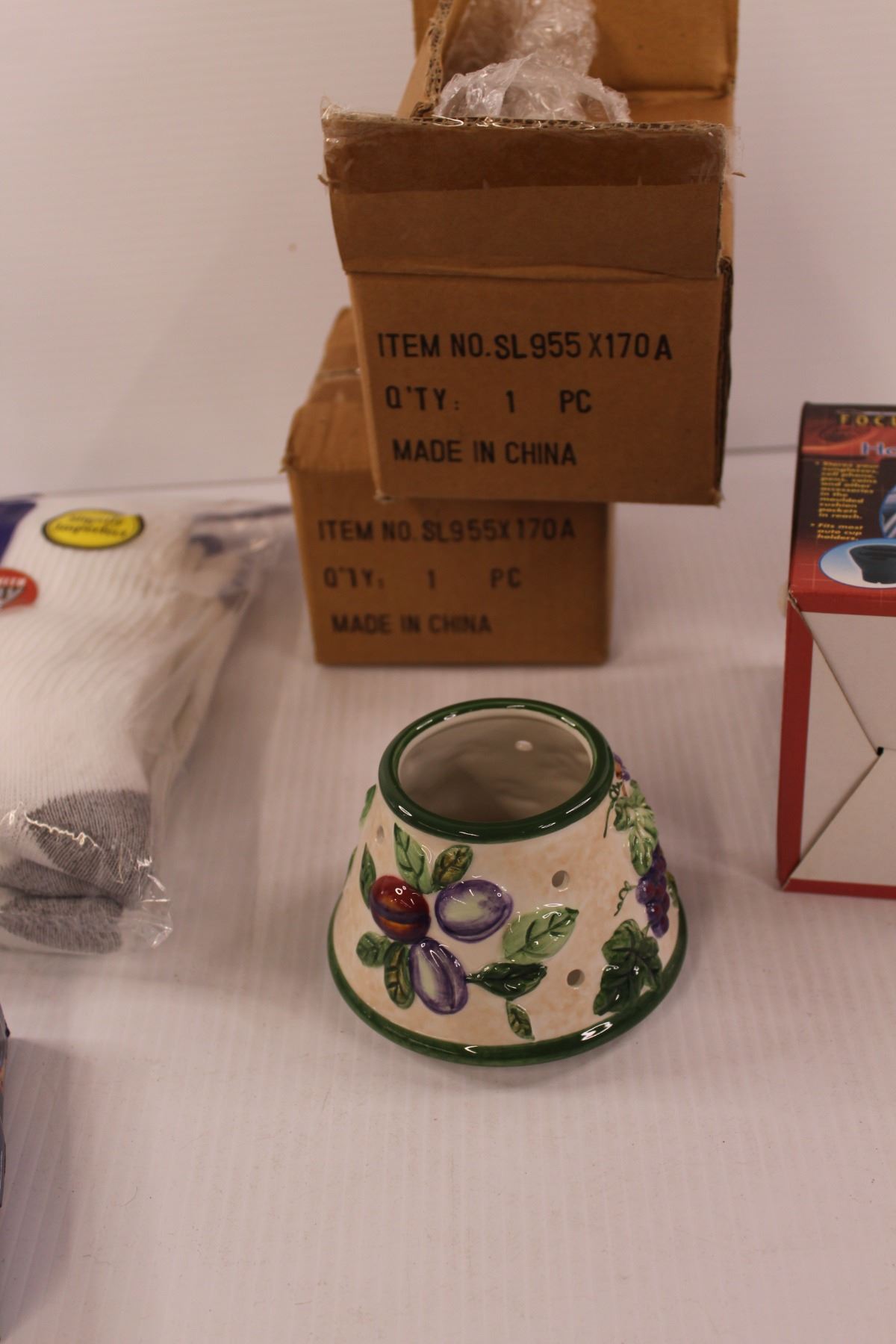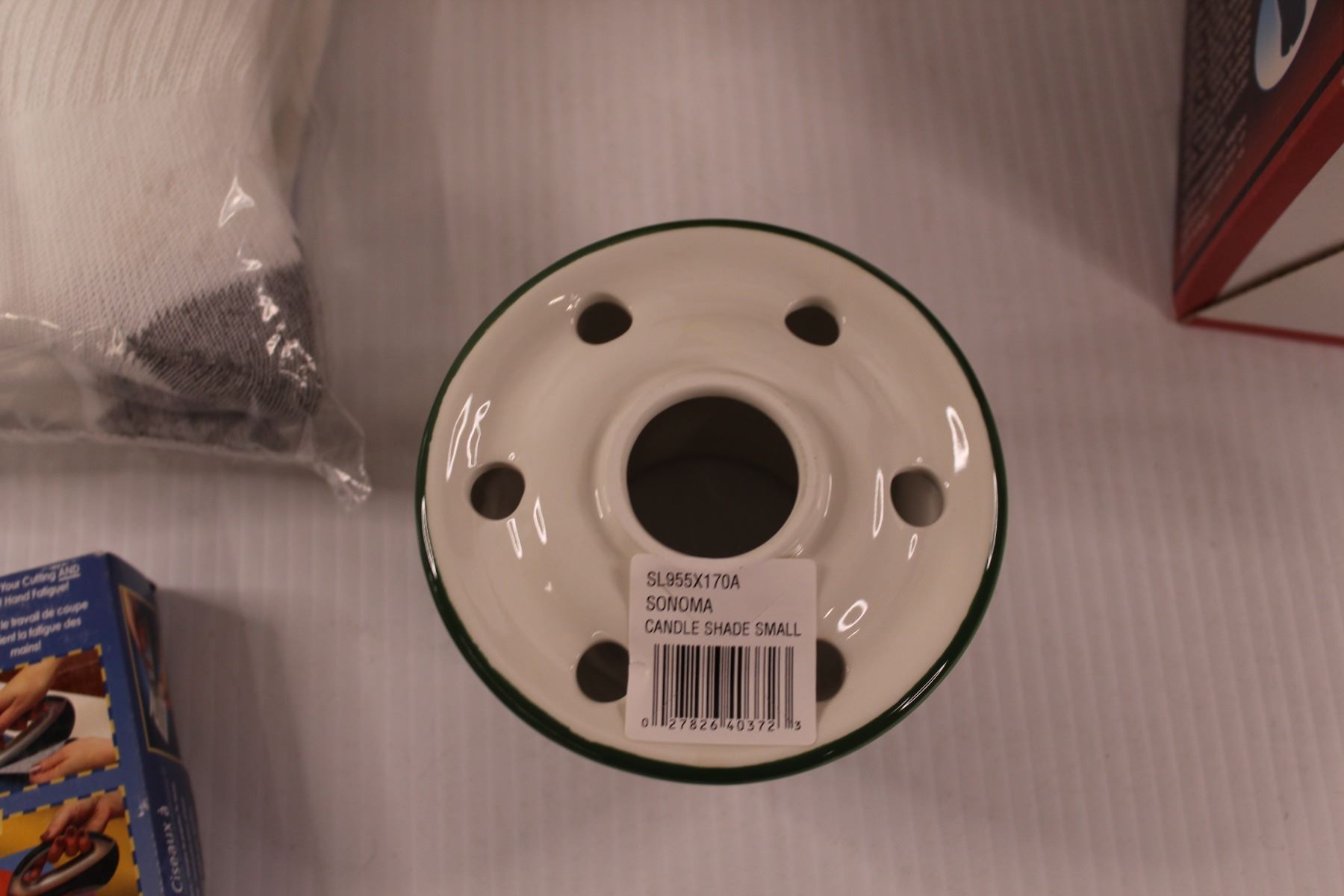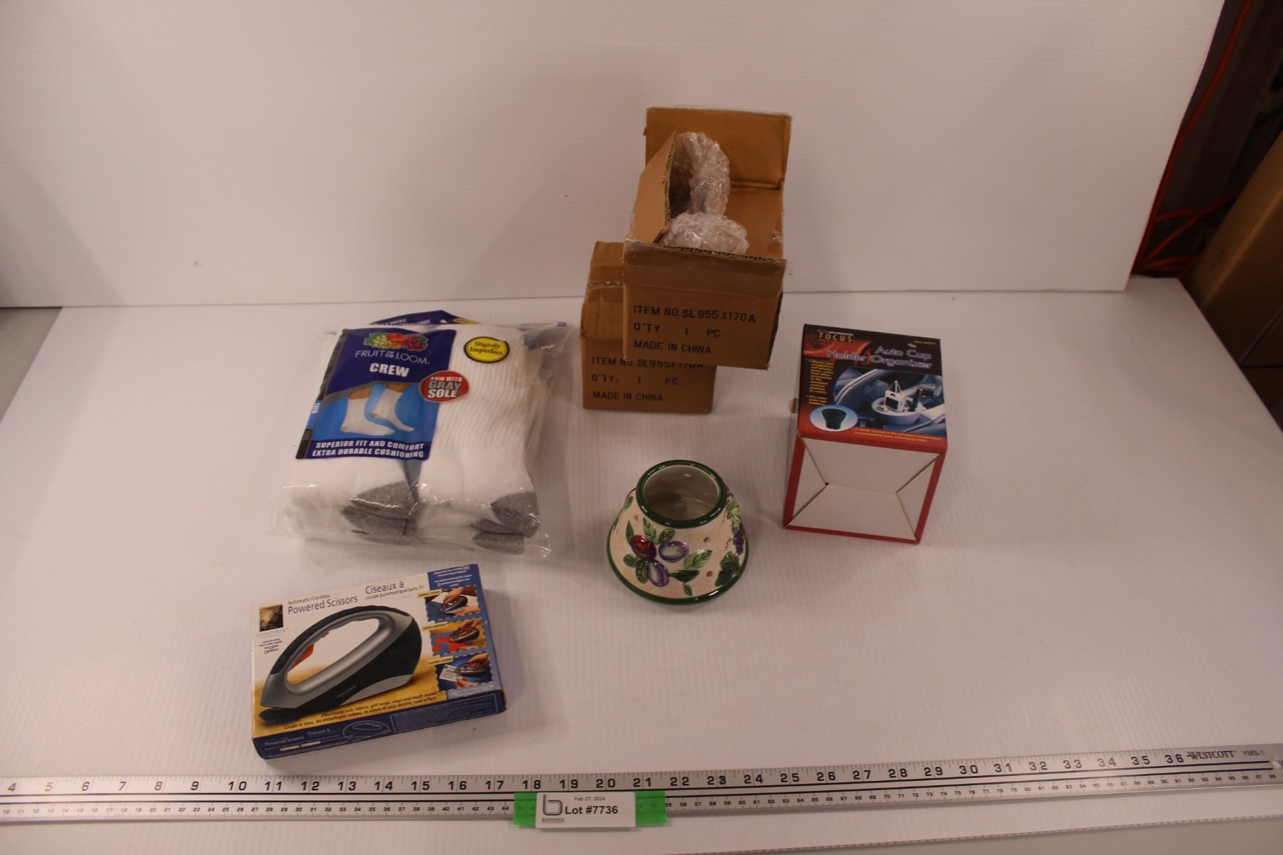 (2) Small Candle Shade (New in Box), Automatic/Cordless Powered Scissors (New in Box) , Focus Auto Cup Holder Organizer & Fruit of The Loom Crew Socks (12-16)