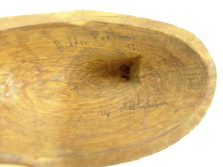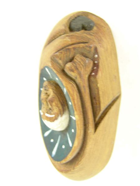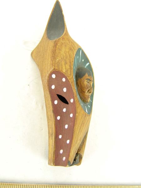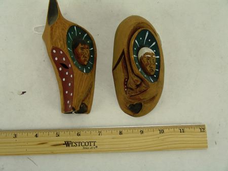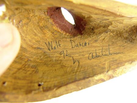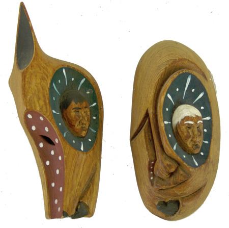 Ca. 1999, Pair of finely carved miniature wooden masks - "Hidden Feelings" and "Wolf Dance," signed. Very good condition. Larger 2-3/4" x 6-1/2" x 1-1/2"