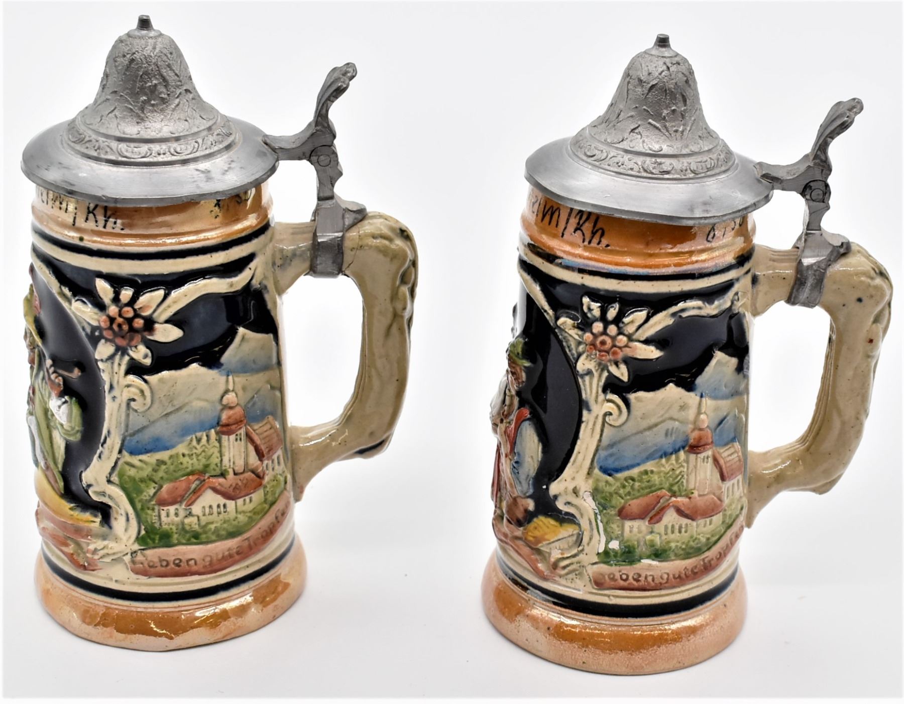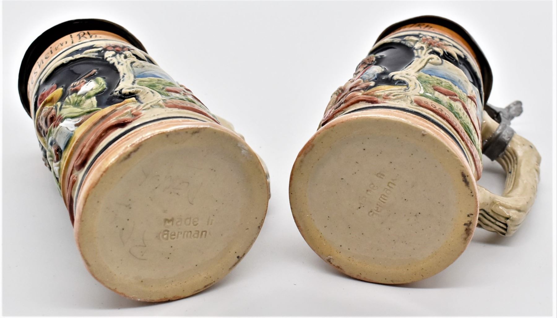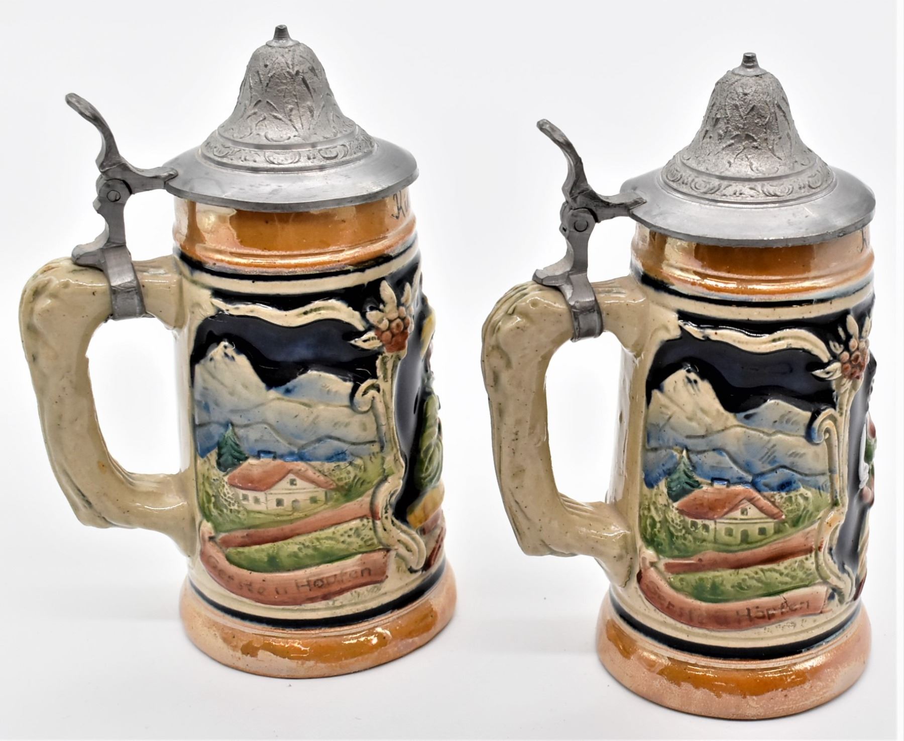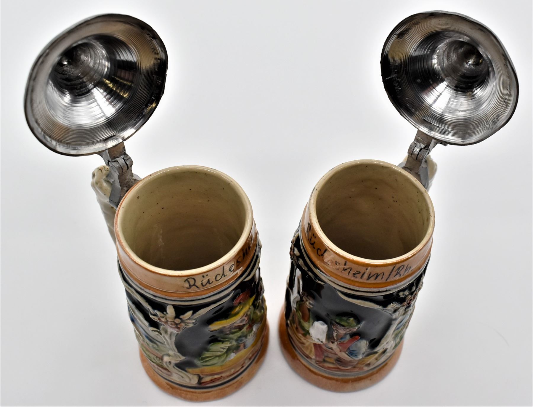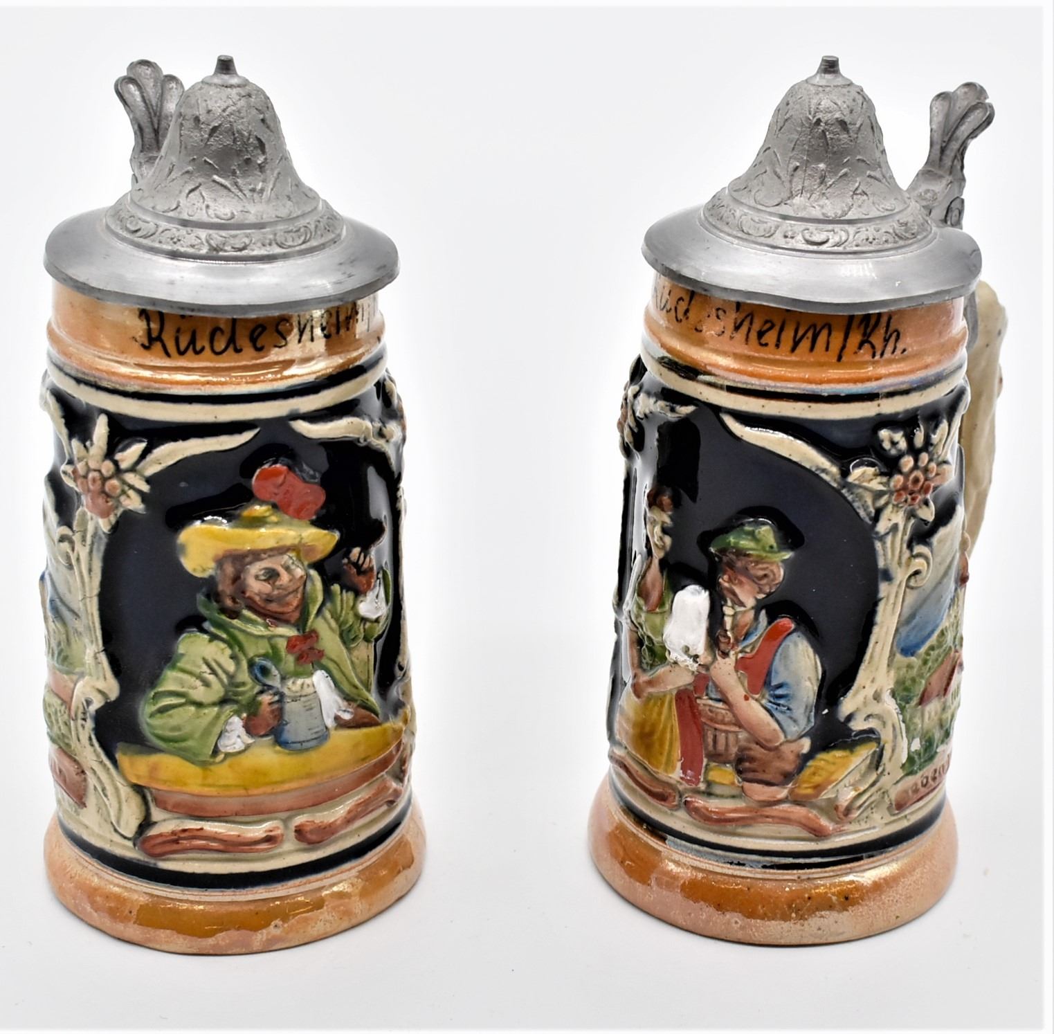 2 Small German Beer Steins, largest measures 5.75''H x 3.5''L x 2.75''D, marked Rudescheim/Rh., embossed ''Made in Germany'' on the bottom, both have pewter lids, both have ''Gerste u Hopfen'' (Barley and Hops) on one side and ''Gebengute Tropfer'' (Create good drops) on the other