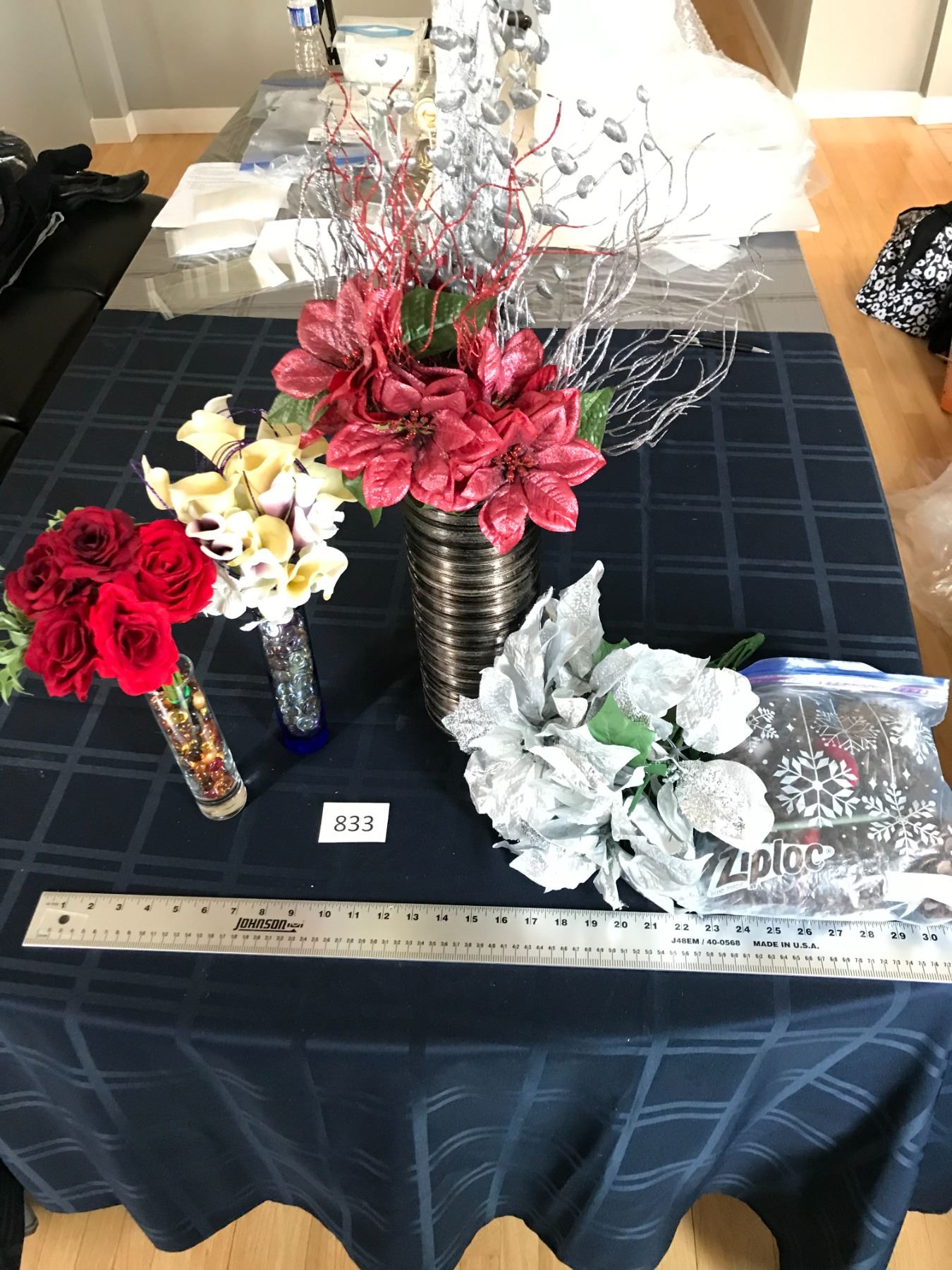 2 Small Glass Vases with Silk Flowers & Glass Stones