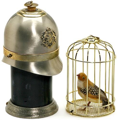 2 Small Musical Automatons 1) Musical helmet with bottle, clockwork-driven, with musical movement for 1 tune. 9 7/8 in. high. - And: 2) Singing bird cage, battery-powered, 7 in. high.<Br>