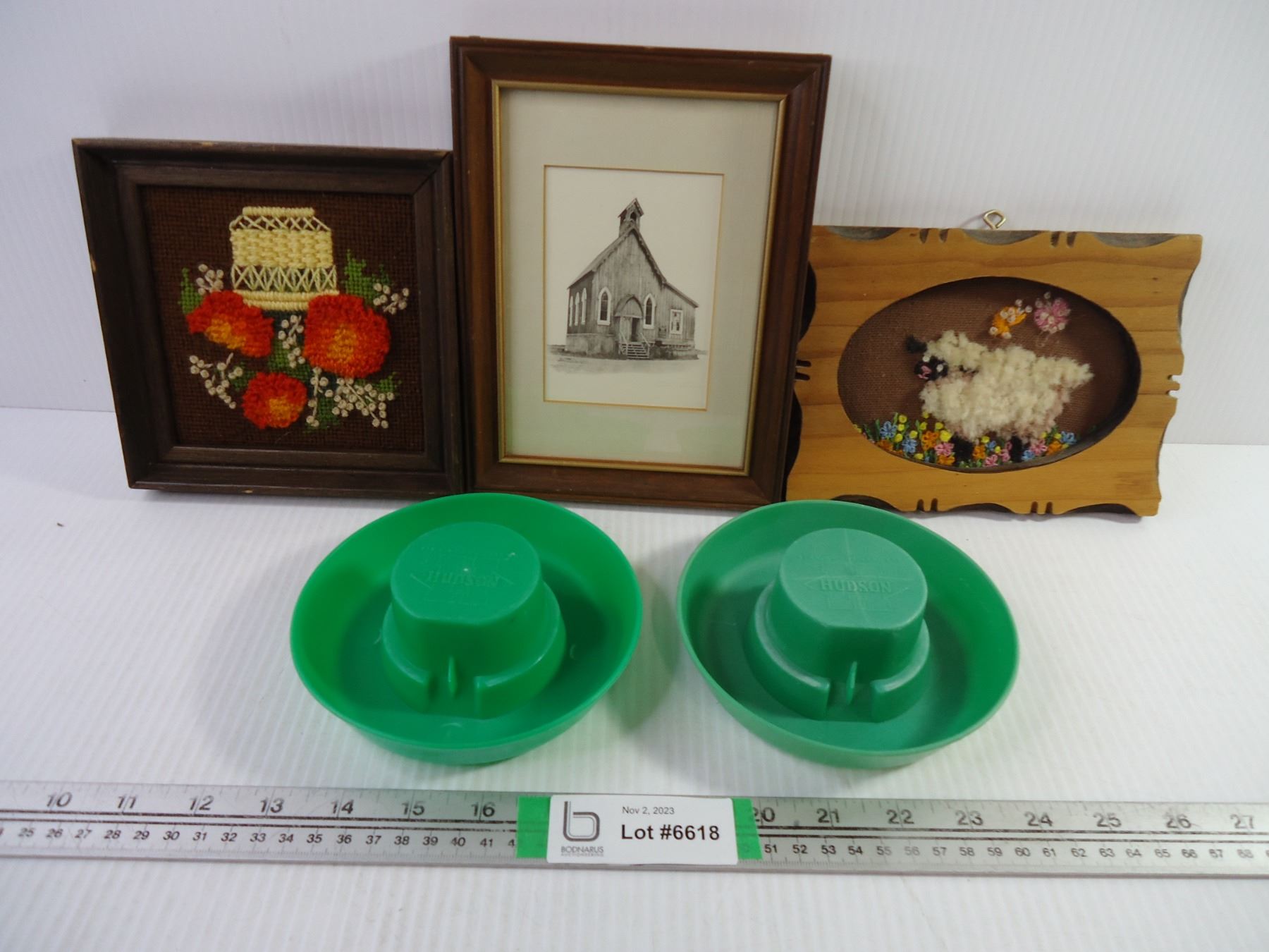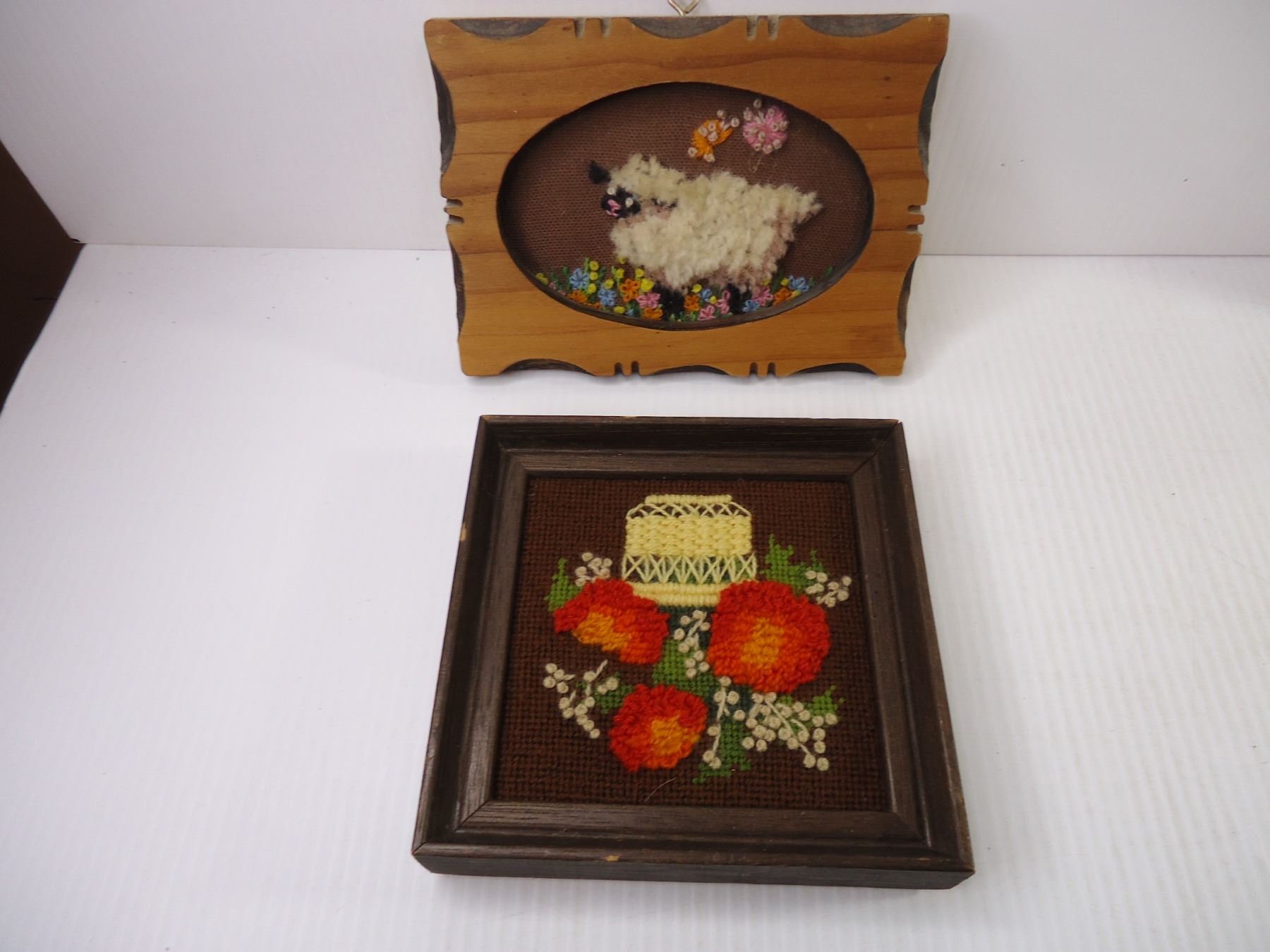 (2) Small Needlepoints, Church Picture and (2) Lids??