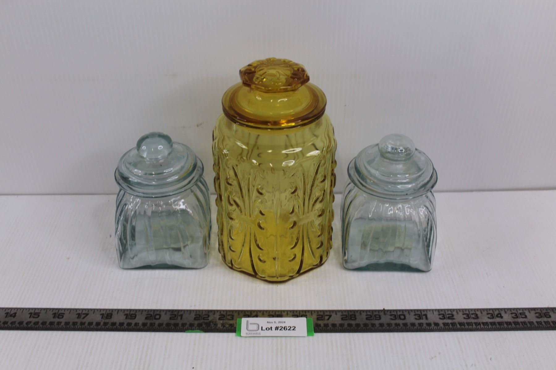 (2) Small Square Glass Jars w/Lids 4"x5" & Vintage Amber Glass Cannister w/Lid 5.5"x9"