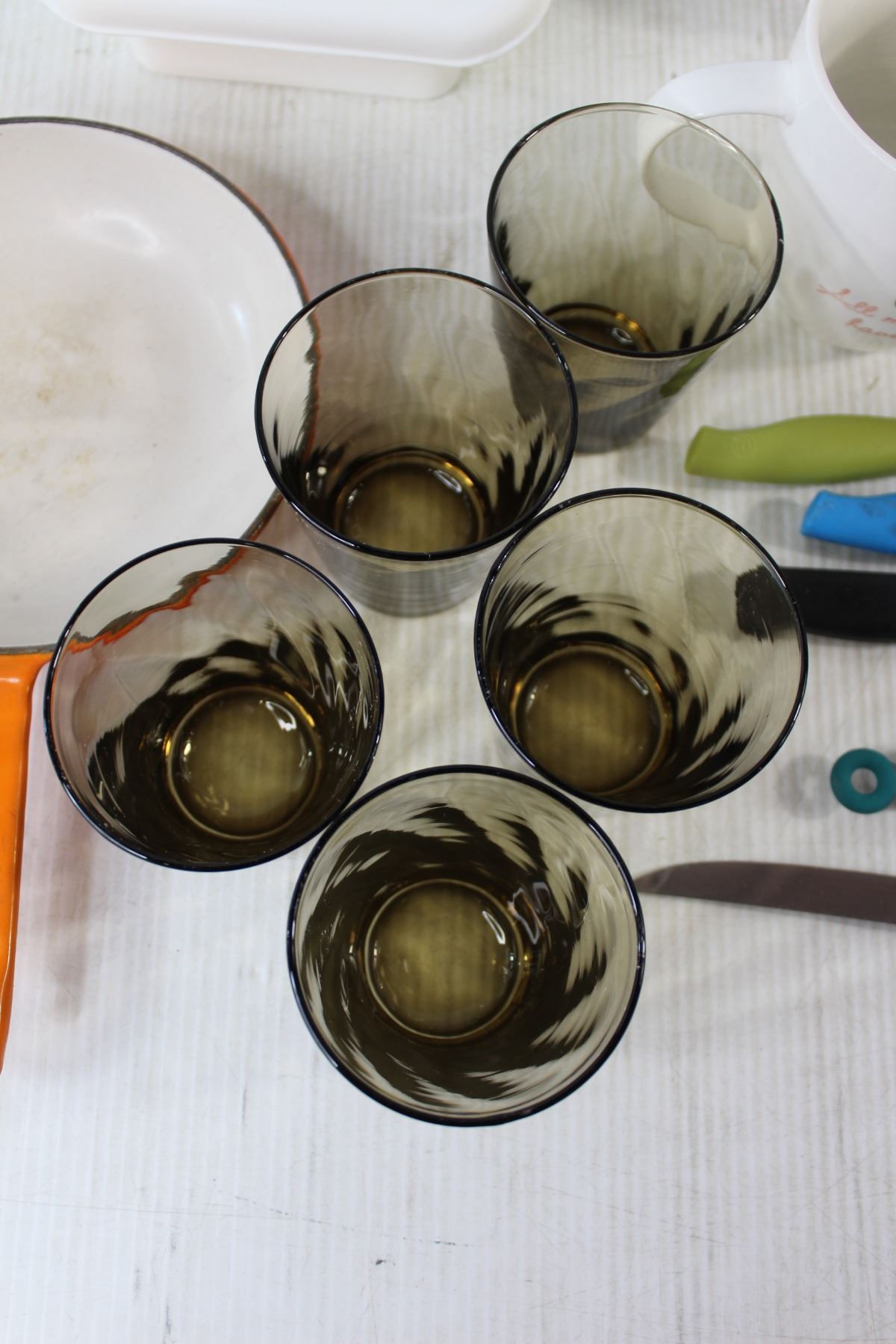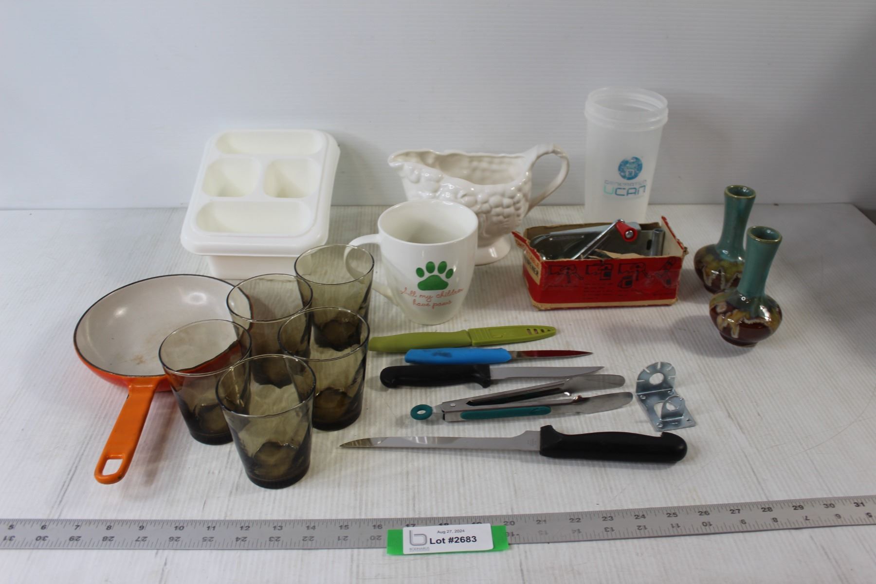 (2) Small Vases, Comfortable Can Opener, Pitcher, Mug, (4) Assorted Kitchen Knives, Small tongs, (5) Glasses, Small Frying Pan, Separated Utensil Drying Rack
