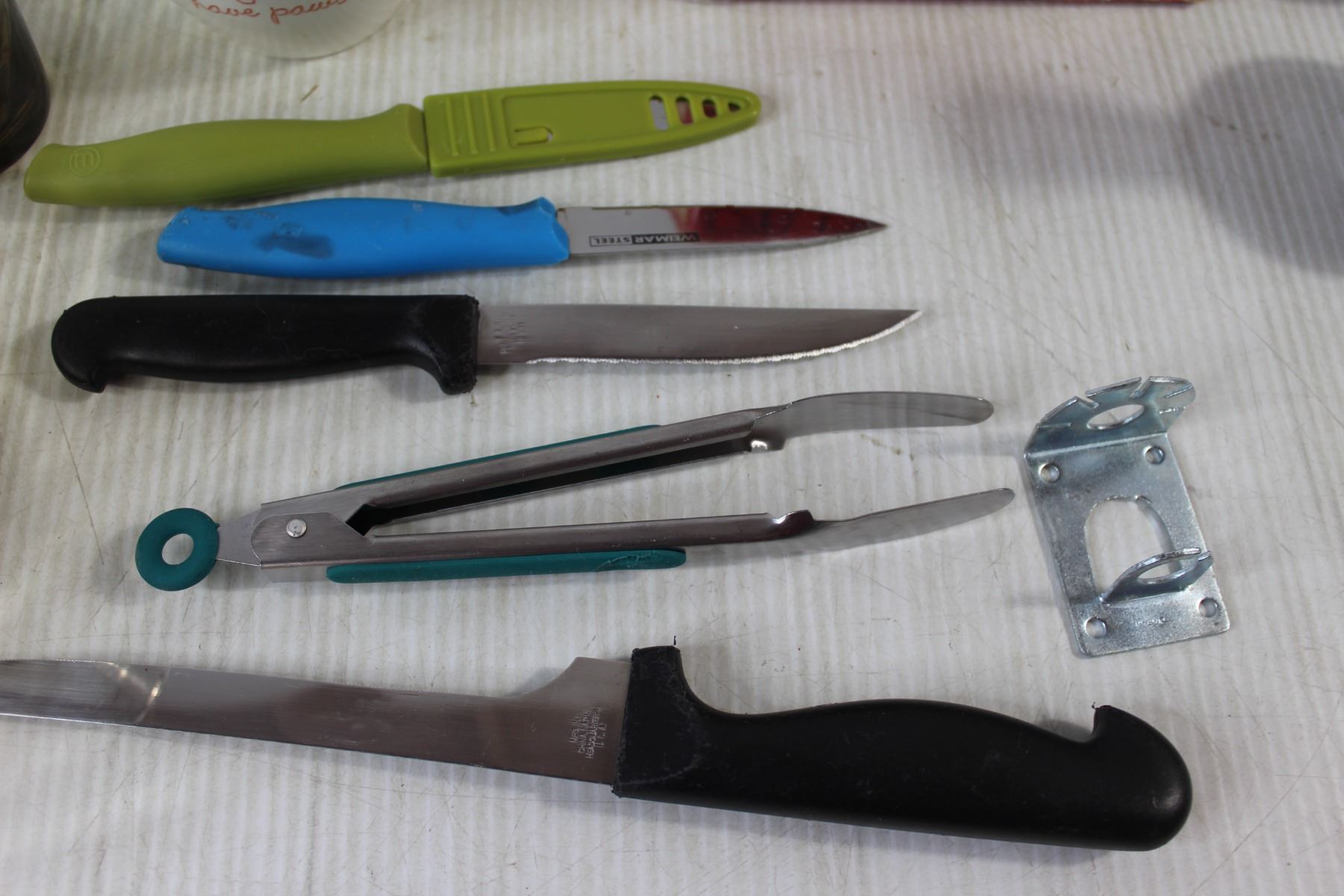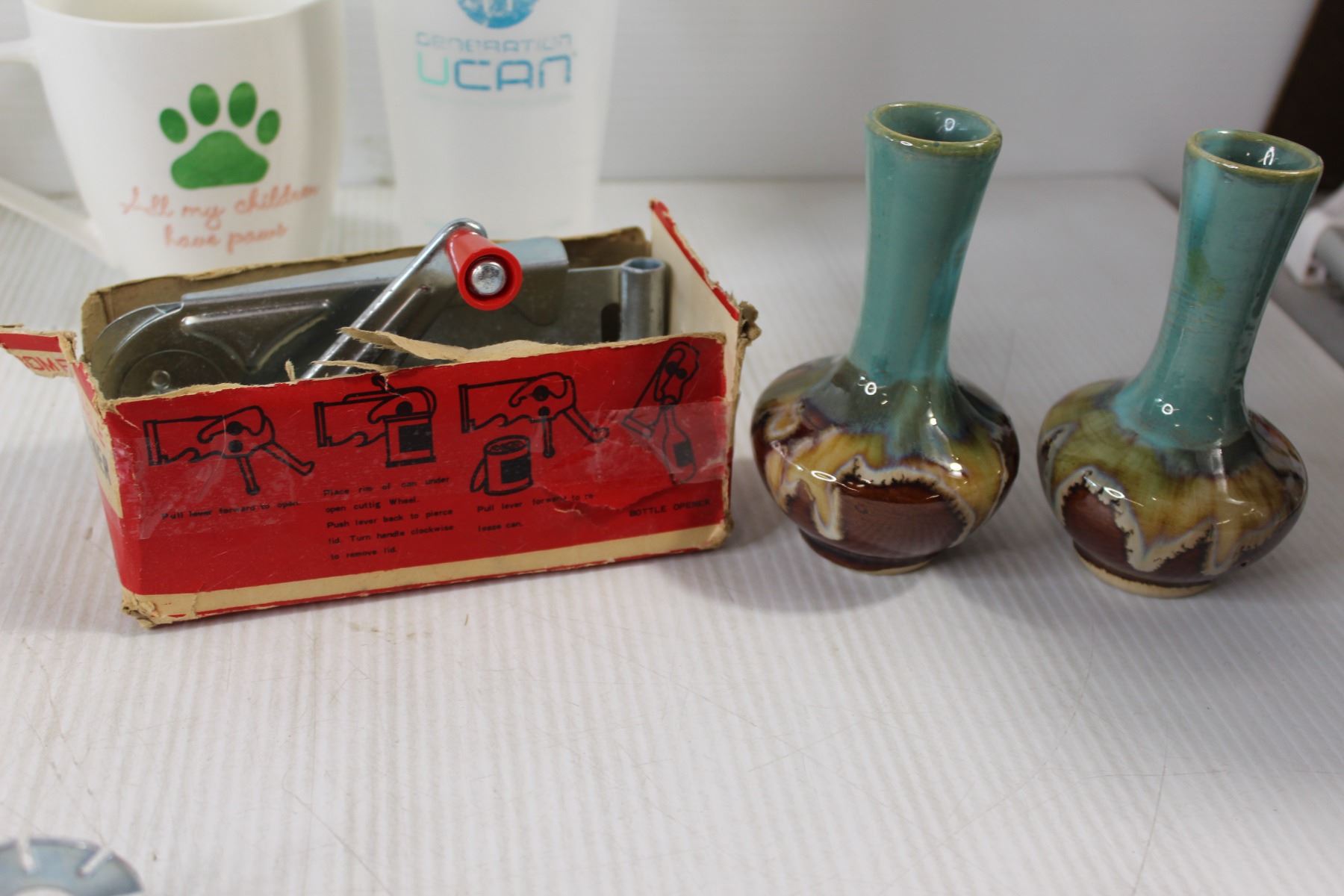(2) Small Vases, Comfortable Can Opener, Pitcher, Mug, (4) Assorted Kitchen Knives, Small tongs, (5)