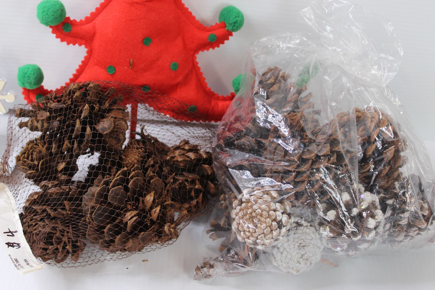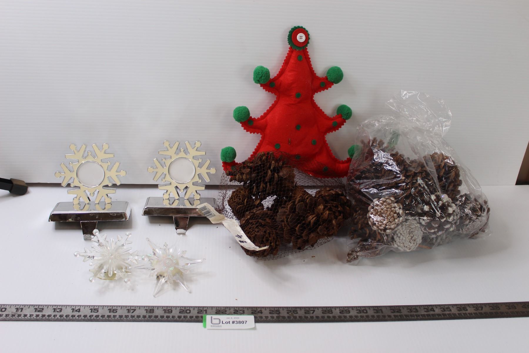 (2) Snowflake Mantle Stocking Hangers, (2) Snowflake Window Decorations (one suction cup broken), (2) Bags of Pine Cones, Crafty Homemade Christmas Tree