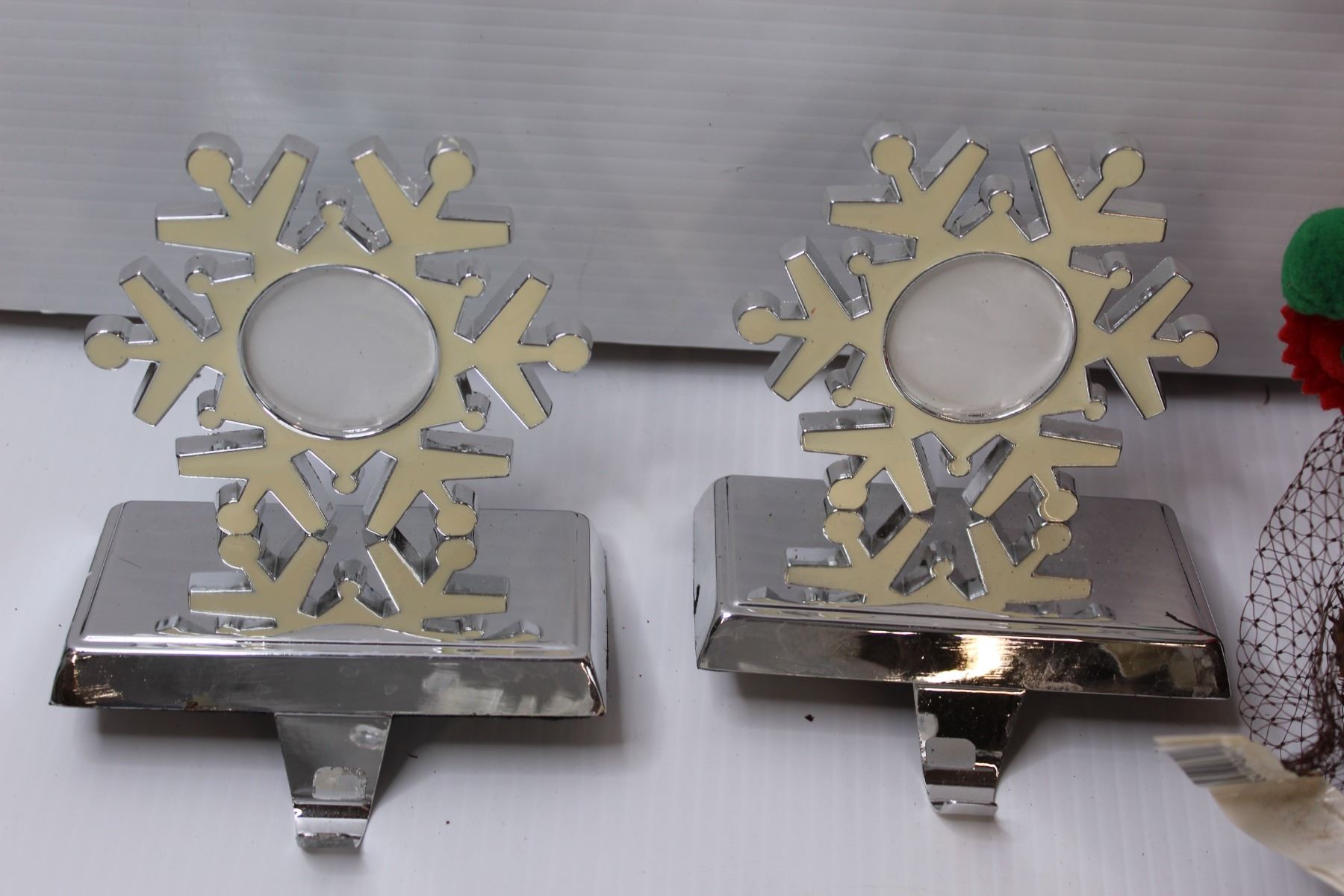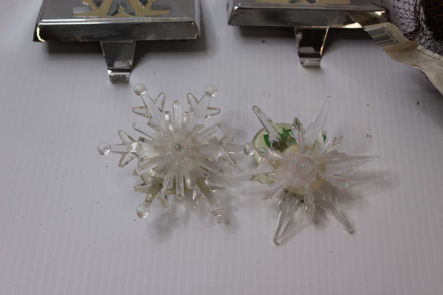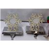 (2) Snowflake Mantle Stocking Hangers, (2) Snowflake Window Decorations (one suction cup broken), (2