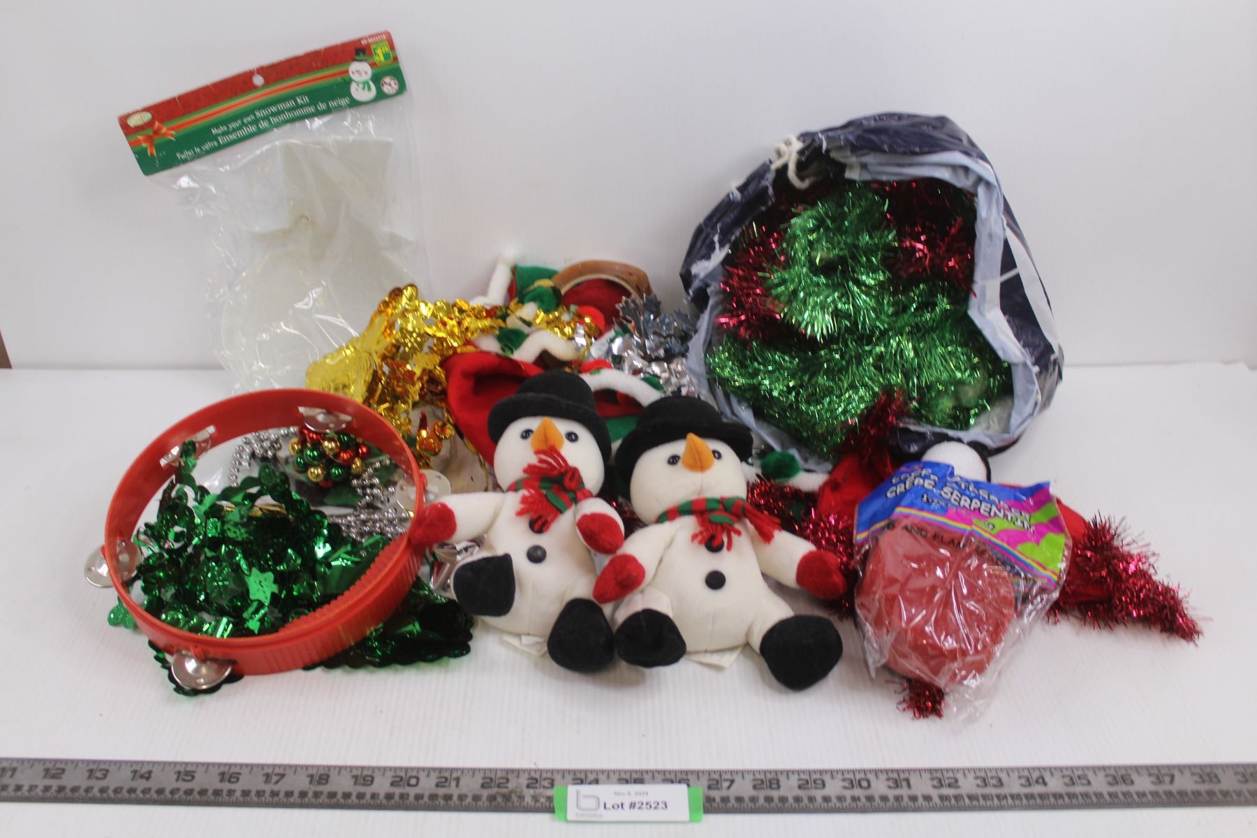(2) Snowman Stuffies, Make Your Own Snowman Kit, Tambourine, Assorted Christmas Decorations