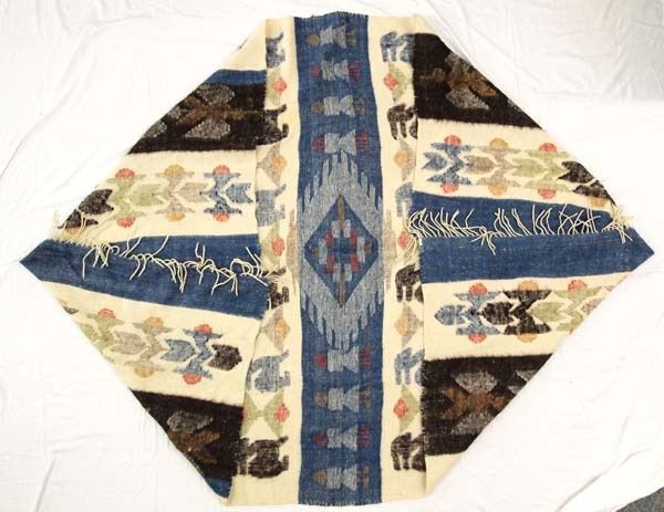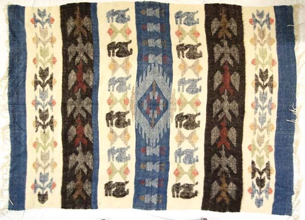 2 South American 100 Percent Wool Hand Woven Textiles, one is rabbit motif and measures 64'' x 94'' which includes fringe, the other is people and bird motif measuring 24'' x 76''