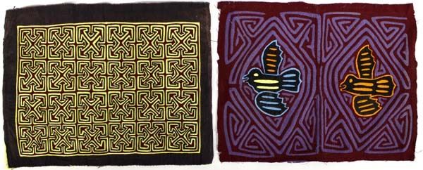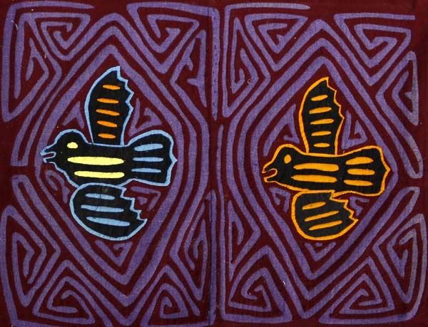 2 South American Kuna Indian Molas, includes: 1. Hand Stitched Double Bird, measures 12.5'' x 16'' 2. Eye Dazzler Hand Stitched, measures 12'' x 16'', FYI: ''When Kuna women tire of a particular blouse, they disassemble it and sell the molas to collectors. Since mola panels have been worn as part of the traditional dress of a Kuna woman they often show signs of wear such as fading and stitch marks along the edges of the panels.''
