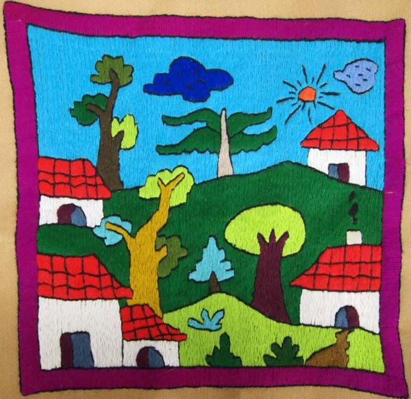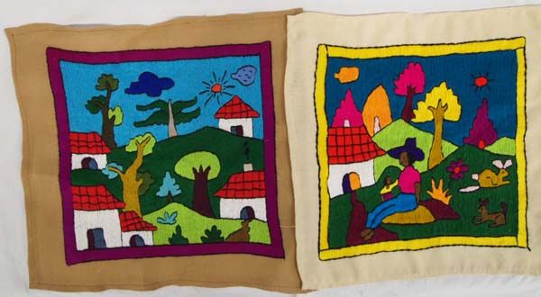2 South American Pieces of Embroidery on Cloth. Both are done in gorgeous vivid colors. and depict landscape scenes, Their approx. measurment is 17'' x 15.5''