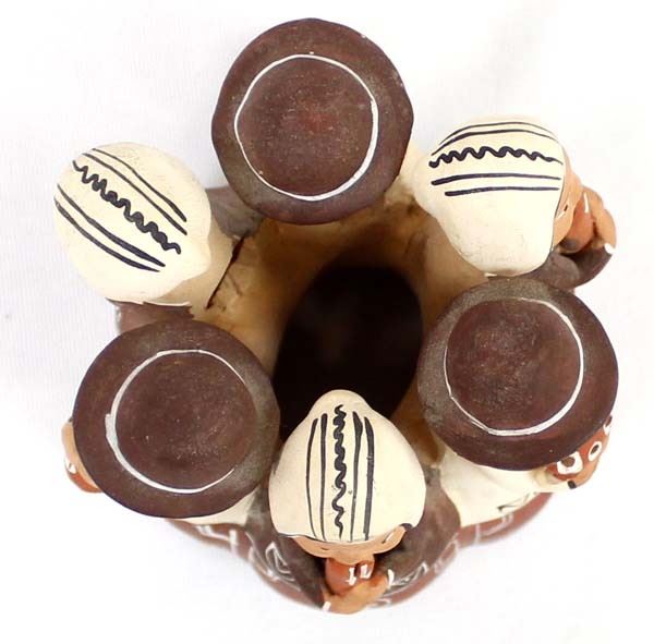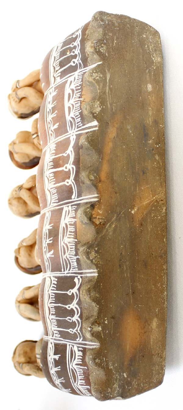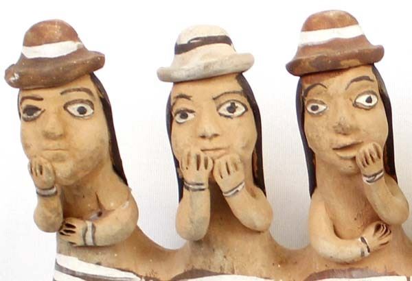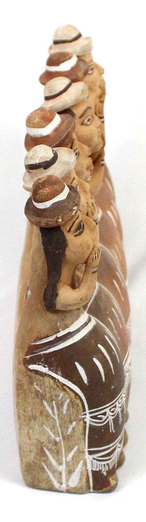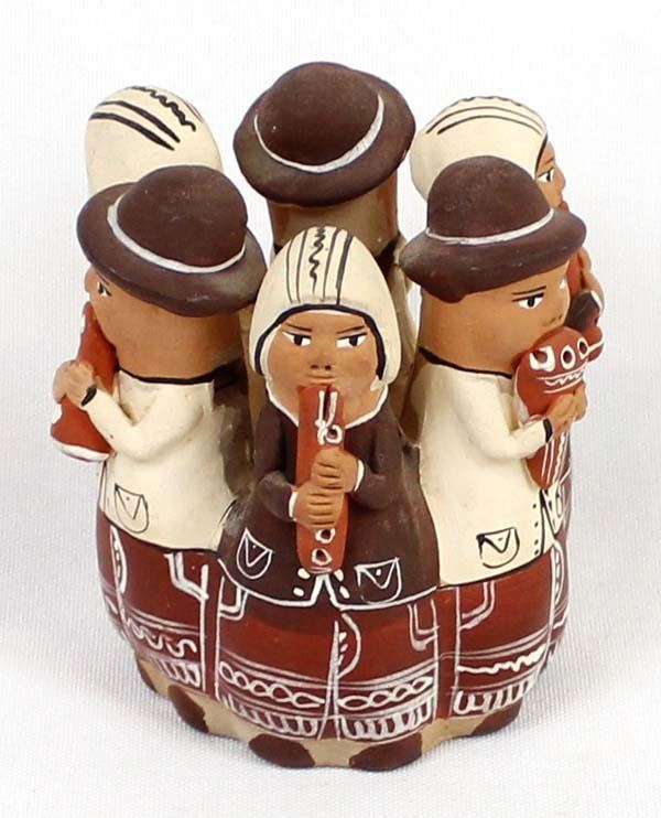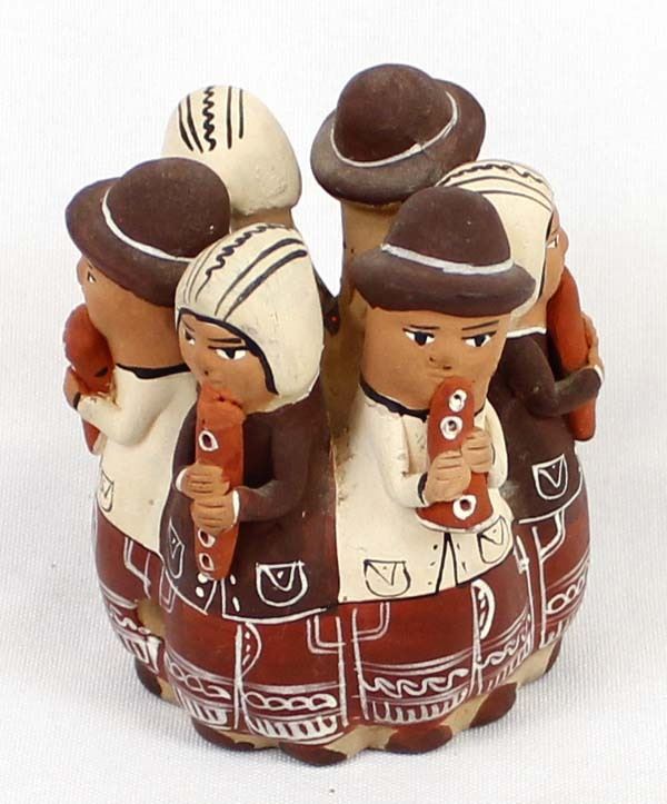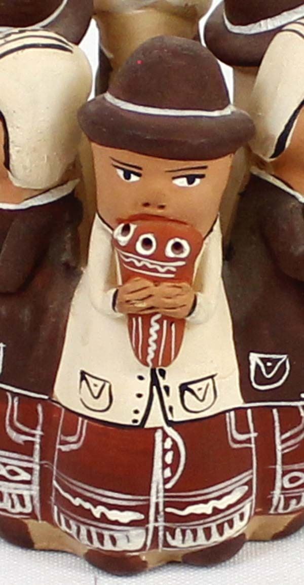 2 South American Pottery Pieces. One is a flute and the other a circle of children playing instruments. the flute is 5'' x 10'' and the childs band is 3'' x 3'' Has been glued in one place.
