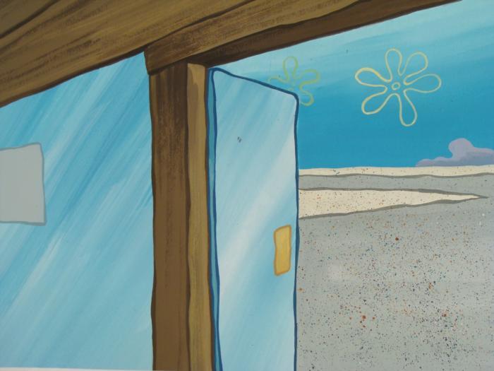 These are 2 original hand-painted backgrounds from the Nickelodeon television show SpongeBob Squarepants. The story takes place under the deep blue sea in Bikini Bottom, where SpongeBob resides. SpongeBob, who is a yellow, porous sponge, is your typical happy-go-lucky character, as he is always cheerful and enjoys making people laugh. Patrick Star, SpongeBob's neighbor who is a starfish, is your average children's show idiot, as he boasts knowing nothing and is often getting himself into ridiculous situations. Between the homes of these two lies the home of the miserable Squidward, a squid, who is known for being grouchy and playing tricks on SpongeBob and Patrick. Both SpongeBob and Squidward work at the Krusty Krab, a fast food business run by the greedy money-loving Mr. Krabs, a crab, the arch rival of the evil, possibly misunderstood, Plankton. Another neighbor, Sandy Cheeks, an athletic squirrel who normally wears an astronaut's space suit, was introduced in "Tea at the Treedome." She spends most of her time inventing and experimenting. The backgrounds here are from the Krusty Krab dining area. It appears there has been some sort of problem at the Krusty Krab, as one image shows a broken table and boards on the floor. Original Production Background on paper, with peg holes Sizes of sheets: 10 1/4 x 11 3/4, and 10 1/4 x 12 1/4 inchesVery good condition, with slight wrinkling on the right edges; have been stored rolledOriginal Production Backgrounds are used in the making of the final version of animated productions. The background establishes the location and the overall good mood of the scene. Typically, a background layout artist creates a drawing to establish the content of the scene, placement of characters, perspective and camera angle. Based on this drawing, the background artist creates a preliminary painting to confirm all of the scenes details, then the final production background which is used in the filming of the scene. When these backgrounds are individually photographed behind the progression of production cels, and projected at a rapid succession, the images in the foreground appear to move, creating an animated scene. The backgrounds are ready to be matted and framed. They include animator's notations, and 2003 Viacom copyright stamps at the lower edge. On one the bottom edge has been cut and retaped back on (a possible scene number change made at the studios).