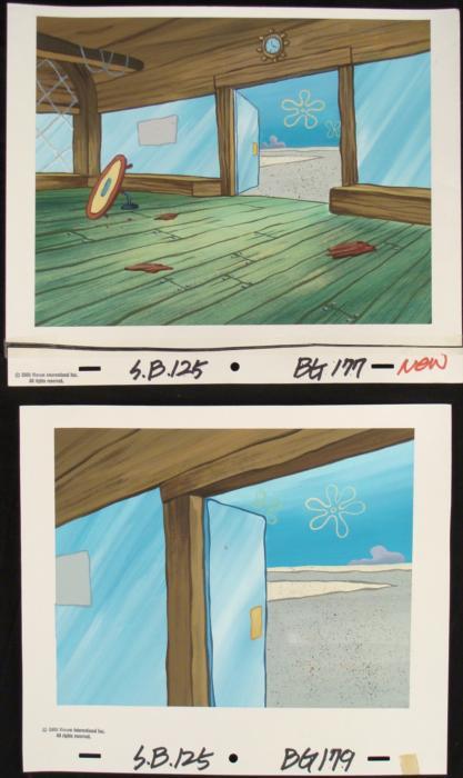 These are 2 original hand-painted backgrounds from the Nickelodeon television show SpongeBob Squarepants. The story takes place under the deep blue sea in Bikini Bottom, where SpongeBob resides. SpongeBob, who is a yellow, porous sponge, is your typical happy-go-lucky character, as he is always cheerful and enjoys making people laugh. Patrick Star, SpongeBob's neighbor who is a starfish, is your average children's show idiot, as he boasts knowing nothing and is often getting himself into ridiculous situations. Between the homes of these two lies the home of the miserable Squidward, a squid, who is known for being grouchy and playing tricks on SpongeBob and Patrick. Both SpongeBob and Squidward work at the Krusty Krab, a fast food business run by the greedy money-loving Mr. Krabs, a crab, the arch rival of the evil, possibly misunderstood, Plankton. Another neighbor, Sandy Cheeks, an athletic squirrel who normally wears an astronaut's space suit, was introduced in "Tea at the Treedome." She spends most of her time inventing and experimenting. The backgrounds here are from the Krusty Krab dining area. It appears there has been some sort of problem at the Krusty Krab, as one image shows a broken table and boards on the floor. Original Production Background on paper, with peg holes Sizes of sheets: 10 1/4 x 11 3/4, and 10 1/4 x 12 1/4 inchesVery good condition, with slight wrinkling on the right edges; have been stored rolledOriginal Production Backgrounds are used in the making of the final version of animated productions. The background establishes the location and the overall good mood of the scene. Typically, a background layout artist creates a drawing to establish the content of the scene, placement of characters, perspective and camera angle. Based on this drawing, the background artist creates a preliminary painting to confirm all of the scenes details, then the final production background which is used in the filming of the scene. When these backgrounds are individually photographed behind the progression of production cels, and projected at a rapid succession, the images in the foreground appear to move, creating an animated scene. The backgrounds are ready to be matted and framed. They include animator's notations, and 2003 Viacom copyright stamps at the lower edge. On one the bottom edge has been cut and retaped back on (a possible scene number change made at the studios).