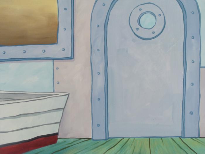 These are 2 original hand-painted backgrounds from the Nickelodeon television show SpongeBob Squarepants. The story takes place under the deep blue sea in Bikini Bottom, where SpongeBob resides. SpongeBob, who is a yellow, porous sponge, is your typical happy-go-lucky character, as he is always cheerful and enjoys making people laugh. Patrick Star, SpongeBob's neighbor who is a starfish, is your average children's show idiot, as he boasts knowing nothing and is often getting himself into ridiculous situations. Between the homes of these two lies the home of the miserable Squidward, a squid, who is known for being grouchy and playing tricks on SpongeBob and Patrick. Both SpongeBob and Squidward work at the Krusty Krab, a fast food business run by the greedy money-loving Mr. Krabs, a crab, the arch rival of the evil, possibly misunderstood, Plankton. Another neighbor, Sandy Cheeks, an athletic squirrel who normally wears an astronaut's space suit, was introduced in "Tea at the Treedome." She spends most of her time inventing and experimenting. The backgrounds here are from the Krusty Krab dining area.Original Production Background on paper, with peg holes Size of each sheet: 10 x 14 inchesVery good condition; having been stored rolledOriginal Production Backgrounds are used in the making of the final version of animated productions. The background establishes the location and the overall good mood of the scenee. Typically, a background layout artist creates a drawing to establish the content of the scene, placement of characters, perspective and camera angle. Based on this drawing, the background artist creates a preliminary painting to confirm all of the scenes details, then the final production background which is used in the filming of the scene. When these backgrounds are individually photographed behind the progression of production cels, and projected at a rapid succession, the images in the foreground appear to move, creating an animated scene. The backgrounds are ready to be matted and framed. They include animator's notations, and one has a 2003 Viacom copyright stamp at the lower edge.