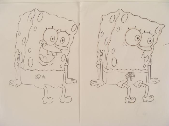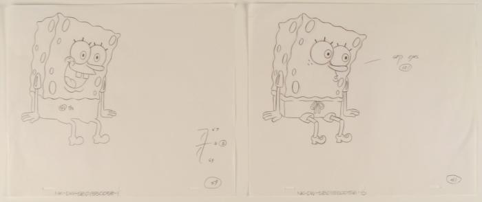 This original animation art pencil drawing was done for SpongeBob Squarepants. There are animator notations. Depicted here is SpongeBob sitting with two different expressions. This is from a scene with Plankton.The story takes place under the deep blue sea in Bikini Bottom, where SpongeBob resides. SpongeBob, who is a yellow, porous sponge, is your typical happy-go-lucky character, as he is always cheerful and enjoys making people laugh. Patrick Star, SpongeBob's neighbor who is a starfish, is your average children's show idiot, as he boasts knowing nothing and is often getting himself into ridiculous situations. Between the homes of these two lies the home of the miserable Squidward, a squid, who is known for being grouchy and playing tricks on SpongeBob and Patrick. Both SpongeBob and Squidward work at the Krusty Krab, a fast food business run by the greedy money-loving Mr. Krabs, a crab, the arch rival of the evil, possibly misunderstood, Plankton. Another neighbor, Sandy Cheeks, an athletic squirrel who normally wears an astronaut's space suit, was introduced in "Tea at the Treedome." She spends most of her time inventing and experimenting. Original "rough" animation drawing, in graphite and brown pencil.Overall size is a 12-field drawing that is 10 1/2" × 12 1/2" Excellent condition; slight wrinkling to the paperTraditional animation is a multi-step process which includes various types of art techniques. Drawings are a key part of the process, in which the animator creates the design and movement of the characters. Drawings are then transferred onto acetate cels (by hand-inking and/or photo copying) to create a production cel, which is then hand painted on the back side, using paint colors chosen and approved by the creator of the series. The drawings are ready to framed and matted.