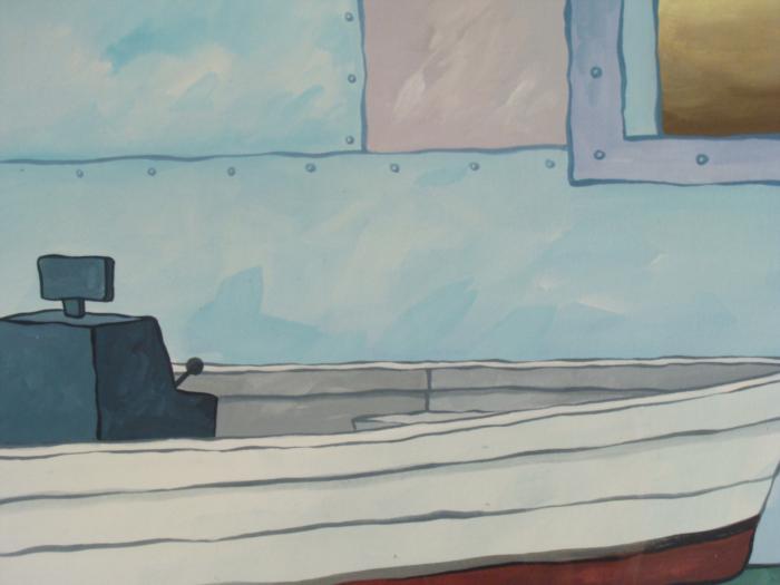 These are 2 original hand-painted backgrounds from the Nickelodeon television show SpongeBob Squarepants. The story takes place under the deep blue sea in Bikini Bottom, where SpongeBob resides. SpongeBob, who is a yellow, porous sponge, is your typical happy-go-lucky character, as he is always cheerful and enjoys making people laugh. Patrick Star, SpongeBob's neighbor who is a starfish, is your average children's show idiot, as he boasts knowing nothing and is often getting himself into ridiculous situations. Between the homes of these two lies the home of the miserable Squidward, a squid, who is known for being grouchy and playing tricks on SpongeBob and Patrick. Both SpongeBob and Squidward work at the Krusty Krab, a fast food business run by the greedy money-loving Mr. Krabs, a crab, the arch rival of the evil, possibly misunderstood, Plankton. Another neighbor, Sandy Cheeks, an athletic squirrel who normally wears an astronaut's space suit, was introduced in "Tea at the Treedome." She spends most of her time inventing and experimenting. The backgrounds here are from the Krusty Krab dining area. They are close-ups of the boat cash register.Original Production Background on paper, with peg holes Size of each sheet: 10 x 14 inchesVery good condition; have been stored rolledOriginal Production Backgrounds are used in the making of the final version of animated productions. The background establishes the location and the overall good mood of the scenee. Typically, a background layout artist creates a drawing to establish the content of the scene, placement of characters, perspective and camera angle. Based on this drawing, the background artist creates a preliminary painting to confirm all of the scenes details, then the final production background which is used in the filming of the scene. When these backgrounds are individually photographed behind the progression of production cels, and projected at a rapid succession, the images in the foreground appear to move, creating an animated scene. The backgrounds are ready to be matted and framed. One has a clear acetate cel taped at the bottom edge; Both include animator's notations, and one has a 2003 Viacom copyright stamp at the lower edge.