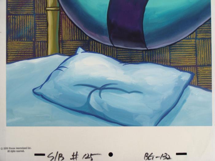 These are 2 original hand-painted backgrounds from the Nickelodeon television show SpongeBob Squarepants. The story takes place under the deep blue sea in Bikini Bottom, where SpongeBob resides. SpongeBob, who is a yellow, porous sponge, is your typical happy-go-lucky character, as he is always cheerful and enjoys making people laugh. His best friend and neighbor is Patrick Star, a starfish who boasts knowing nothing and is often getting himself into ridiculous situations. Between the homes of these two lies the home of the miserable Squidward, a squid, who is known for being grouchy and playing tricks on SpongeBob and Patrick. Both SpongeBob and Squidward work at the Krusty Krab, a fast food business run by the greedy money-loving Mr. Krabs, a crab, the arch rival of the evil, possibly misunderstood, Plankton. Another neighbor, Sandy Cheeks, an athletic squirrel who normally wears an astronaut's space suit, was introduced in "Tea at the Treedome." She spends most of her time inventing and experimenting. These backgrounds are interiors of SpongeBob's bedroom. One shows his pillow, and the other has an image of his wall or wallpaper. Original Production Background on paper, with peg holes Sizes of sheets: 10 1/8 x 12 3/4 inchesVery good condition; have been stored rolledOriginal Production Backgrounds are used in the making of the final version of animated productions. The background establishes the location and the overall good mood of the scene. Typically, a background layout artist creates a drawing to establish the content of the scene, placement of characters, perspective and camera angle. Based on this drawing, the background artist creates a preliminary painting to confirm all of the scenes details, then the final production background which is used in the filming of the scene. When these backgrounds are individually photographed behind the progression of production cels, and projected at a rapid succession, the images in the foreground appear to move, creating an animated scene. The backgrounds are ready to be matted and framed. They include animator's notations at the lower edge, and one has a 2003 Viacom stamp at the lower left corner.