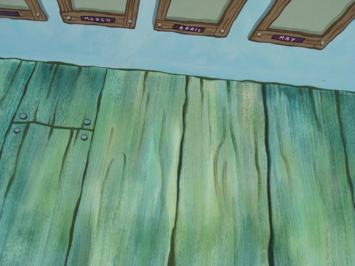 These are 2 original hand-painted backgrounds from the Nickelodeon television show SpongeBob Squarepants. The story takes place under the deep blue sea in Bikini Bottom, where SpongeBob resides. SpongeBob, who is a yellow, porous sponge, is your typical happy-go-lucky character, as he is always cheerful and enjoys making people laugh. Patrick Star, SpongeBob's neighbor who is a starfish, is your average children's show idiot, as he boasts knowing nothing and is often getting himself into ridiculous situations. Between the homes of these two lies the home of the miserable Squidward, a squid, who is known for being grouchy and playing tricks on SpongeBob and Patrick. Both SpongeBob and Squidward work at the Krusty Krab, a fast food business run by the greedy money-loving Mr. Krabs, a crab, the arch rival of the evil, possibly misunderstood, Plankton. Another neighbor, Sandy Cheeks, an athletic squirrel who normally wears an astronaut's space suit, was introduced in "Tea at the Treedome." She spends most of her time inventing and experimenting. These backgrounds are from the episode titled "Employee of the Month." Shown here is the wall of frames where the employees are honored. Original Production Background on paper, with peg holes Sizes of sheets: 10 x 12 1/4, and 10 x 14 inchesVery good condition; have been stored rolledOriginal Production Backgrounds are used in the making of the final version of animated productions. The background establishes the location and the overall good mood of the scenee. Typically, a background layout artist creates a drawing to establish the content of the scene, placement of characters, perspective and camera angle. Based on this drawing, the background artist creates a preliminary painting to confirm all of the scenes details, then the final production background which is used in the filming of the scene. When these backgrounds are individually photographed behind the progression of production cels, and projected at a rapid succession, the images in the foreground appear to move, creating an animated scene. The backgrounds are ready to be matted and framed. Both include animator's notations, and one has a 2003 Viacom copyright stamp at the lower edge.