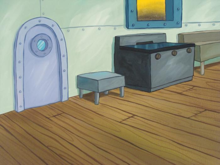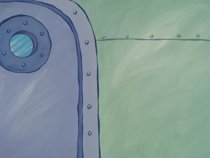 These are 2 original hand-painted backgrounds from the Nickelodeon television show SpongeBob Squarepants. The story takes place under the deep blue sea in Bikini Bottom, where SpongeBob resides. SpongeBob, who is a yellow, porous sponge, is your typical happy-go-lucky character, as he is always cheerful and enjoys making people laugh. Patrick Star, SpongeBob's neighbor who is a starfish, is your average children's show idiot, as he boasts knowing nothing and is often getting himself into ridiculous situations. Between the homes of these two lies the home of the miserable Squidward, a squid, who is known for being grouchy and playing tricks on SpongeBob and Patrick. Both SpongeBob and Squidward work at the Krusty Krab, a fast food business run by the greedy money-loving Mr. Krabs, a crab, the arch rival of the evil, possibly misunderstood, Plankton. Another neighbor, Sandy Cheeks, an athletic squirrel who normally wears an astronaut's space suit, was introduced in "Tea at the Treedome." She spends most of her time inventing and experimenting. The backgrounds here are from the Krusty Krab kitchen. One is a close-up of the door. Based on the numbering, we believe these are from sequential scenes. Original Production Background on paper, with peg holes Size of each sheet: 10 x 14 inchesVery good condition; have been stored rolledOriginal Production Backgrounds are used in the making of the final version of animated productions. The background establishes the location and the overall good mood of the scenee. Typically, a background layout artist creates a drawing to establish the content of the scene, placement of characters, perspective and camera angle. Based on this drawing, the background artist creates a preliminary painting to confirm all of the scenes details, then the final production background which is used in the filming of the scene. When these backgrounds are individually photographed behind the progression of production cels, and projected at a rapid succession, the images in the foreground appear to move, creating an animated scene. The backgrounds are ready to be matted and framed. Both include animator's notations, and one has a 2003 Viacom copyright stamp at the lower edge.