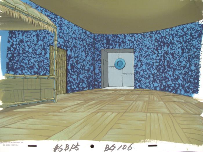 These are 2 original hand-painted backgrounds from the Nickelodeon television show SpongeBob Squarepants. The story takes place under the deep blue sea in Bikini Bottom, where SpongeBob resides. SpongeBob, who is a yellow, porous sponge, is your typical happy-go-lucky character, as he is always cheerful and enjoys making people laugh. His best friend and neighbor is Patrick Star, a starfish who boasts knowing nothing and is often getting himself into ridiculous situations. Between the homes of these two lies the home of the miserable Squidward, a squid, who is known for being grouchy and playing tricks on SpongeBob and Patrick. Both SpongeBob and Squidward work at the Krusty Krab, a fast food business run by the greedy money-loving Mr. Krabs, a crab, the arch rival of the evil, possibly misunderstood, Plankton. Another neighbor, Sandy Cheeks, an athletic squirrel who normally wears an astronaut's space suit, was introduced in "Tea at the Treedome." She spends most of her time inventing and experimenting. These backgrounds are interiors of Squidward's bedroom. One has a close-up of the door.Original Production Background on paper, with peg holes Sizes of sheets: 10 1/4 x 14 inchesVery good condition, with slight wear near the edges; have been stored rolledOriginal Production Backgrounds are used in the making of the final version of animated productions. The background establishes the location and the overall good mood of the scene. Typically, a background layout artist creates a drawing to establish the content of the scene, placement of characters, perspective and camera angle. Based on this drawing, the background artist creates a preliminary painting to confirm all of the scenes details, then the final production background which is used in the filming of the scene. When these backgrounds are individually photographed behind the progression of production cels, and projected at a rapid succession, the images in the foreground appear to move, creating an animated scene. The backgrounds are ready to be matted and framed. They include animator's notations at the lower edge, and 2003 Viacom stamp.