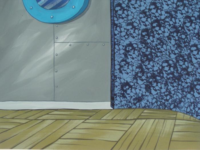 These are 2 original hand-painted backgrounds from the Nickelodeon television show SpongeBob Squarepants. The story takes place under the deep blue sea in Bikini Bottom, where SpongeBob resides. SpongeBob, who is a yellow, porous sponge, is your typical happy-go-lucky character, as he is always cheerful and enjoys making people laugh. His best friend and neighbor is Patrick Star, a starfish who boasts knowing nothing and is often getting himself into ridiculous situations. Between the homes of these two lies the home of the miserable Squidward, a squid, who is known for being grouchy and playing tricks on SpongeBob and Patrick. Both SpongeBob and Squidward work at the Krusty Krab, a fast food business run by the greedy money-loving Mr. Krabs, a crab, the arch rival of the evil, possibly misunderstood, Plankton. Another neighbor, Sandy Cheeks, an athletic squirrel who normally wears an astronaut's space suit, was introduced in "Tea at the Treedome." She spends most of her time inventing and experimenting. These backgrounds are interiors of Squidward's bedroom. One has a close-up of the door.Original Production Background on paper, with peg holes Sizes of sheets: 10 1/4 x 14 inchesVery good condition, with slight wear near the edges; have been stored rolledOriginal Production Backgrounds are used in the making of the final version of animated productions. The background establishes the location and the overall good mood of the scene. Typically, a background layout artist creates a drawing to establish the content of the scene, placement of characters, perspective and camera angle. Based on this drawing, the background artist creates a preliminary painting to confirm all of the scenes details, then the final production background which is used in the filming of the scene. When these backgrounds are individually photographed behind the progression of production cels, and projected at a rapid succession, the images in the foreground appear to move, creating an animated scene. The backgrounds are ready to be matted and framed. They include animator's notations at the lower edge, and 2003 Viacom stamp.