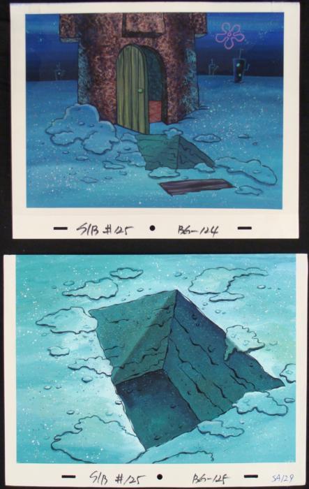 These are 2 original hand-painted backgrounds from the Nickelodeon television show SpongeBob Squarepants. The story takes place under the deep blue sea in Bikini Bottom, where SpongeBob resides. SpongeBob, who is a yellow, porous sponge, is your typical happy-go-lucky character, as he is always cheerful and enjoys making people laugh. His best friend and neighbor is Patrick Star, a starfish who boasts knowing nothing and is often getting himself into ridiculous situations. Between the homes of these two lies the home of the miserable Squidward, a squid, who is known for being grouchy and playing tricks on SpongeBob and Patrick. Both SpongeBob and Squidward work at the Krusty Krab, a fast food business run by the greedy money-loving Mr. Krabs, a crab, the arch rival of the evil, possibly misunderstood, Plankton. Another neighbor, Sandy Cheeks, an athletic squirrel who normally wears an astronaut's space suit, was introduced in "Tea at the Treedome." She spends most of her time inventing and experimenting. These backgrounds are quite spooky. They portray Squidward's house at night, with a freshly dug grave right by the front door. * Original Production Background on paper, with peg holes Sizes of sheets: 10 1/8 x 12 1/2, and 10 1/8 x 13 1/4 inches Very good condition; have been stored rolled Original Production Backgrounds are used in the making of the final version of animated productions. The background establishes the location and the overall good mood of the scenee. Typically, a background layout artist creates a drawing to establish the content of the scene, placement of characters, perspective and camera angle. Based on this drawing, the background artist creates a preliminary painting to confirm all of the scenes details, then the final production background which is used in the filming of the scene. When these backgrounds are individually photographed behind the progression of production cels, and projected at a rapid succession, the images in the foreground appear to move, creating an animated scene. * The backgrounds are ready to be matted and framed. They include animator's notations at the lower edge. One has a clear sheet of acetate taped onto the top edge. *