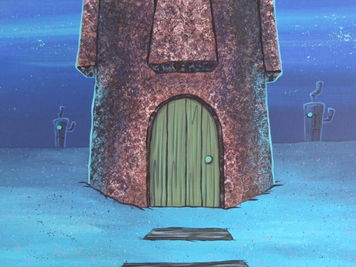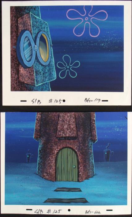 These are 2 original hand-painted backgrounds from the Nickelodeon television show SpongeBob Squarepants. The story takes place under the deep blue sea in Bikini Bottom, where SpongeBob resides. SpongeBob, who is a yellow, porous sponge, is your typical happy-go-lucky character, as he is always cheerful and enjoys making people laugh. Patrick Star, SpongeBob's neighbor who is a starfish, is your average children's show idiot, as he boasts knowing nothing and is often getting himself into ridiculous situations. Between the homes of these two lies the home of the miserable Squidward, a squid, who is known for being grouchy and playing tricks on SpongeBob and Patrick. Both SpongeBob and Squidward work at the Krusty Krab, a fast food business run by the greedy money-loving Mr. Krabs, a crab, the arch rival of the evil, possibly misunderstood, Plankton. Another neighbor, Sandy Cheeks, an athletic squirrel who normally wears an astronaut's space suit, was introduced in "Tea at the Treedome." She spends most of her time inventing and experimenting. The backgrounds here portray Squidward's house at night, with one close-up on a window. * Original Production Background on paper, with peg holes Sizes of sheets: 10 1/8 x 12 1/2, and 10 1/8 x 13 inches Very good condition, with slight wrinkling on the bottom edges; have been stored rolled Original Production Backgrounds are used in the making of the final version of animated productions. The background establishes the location and the overall good mood of the scenee. Typically, a background layout artist creates a drawing to establish the content of the scene, placement of characters, perspective and camera angle. Based on this drawing, the background artist creates a preliminary painting to confirm all of the scenes details, then the final production background which is used in the filming of the scene. When these backgrounds are individually photographed behind the progression of production cels, and projected at a rapid succession, the images in the foreground appear to move, creating an animated scene. * The backgrounds are ready to be matted and framed. They include animator's notations at the lower edge. *