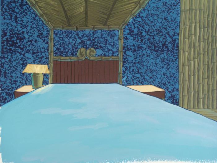 These are 2 original hand-painted backgrounds from the Nickelodeon television show SpongeBob Squarepants. The story takes place under the deep blue sea in Bikini Bottom, where SpongeBob resides. SpongeBob, who is a yellow, porous sponge, is your typical happy-go-lucky character, as he is always cheerful and enjoys making people laugh. His best friend and neighbor is Patrick Star, a starfish who boasts knowing nothing and is often getting himself into ridiculous situations. Between the homes of these two lies the home of the miserable Squidward, a squid, who is known for being grouchy and playing tricks on SpongeBob and Patrick. Both SpongeBob and Squidward work at the Krusty Krab, a fast food business run by the greedy money-loving Mr. Krabs, a crab, the arch rival of the evil, possibly misunderstood, Plankton. Another neighbor, Sandy Cheeks, an athletic squirrel who normally wears an astronaut's space suit, was introduced in "Tea at the Treedome." She spends most of her time inventing and experimenting. These backgrounds are interiors of Squidward's bedroom. One shows his bed from perspective of being in his bed. The other has a close-up of his bed with the covers on.Original Production Background on paper, with peg holes, including one with cel overlay Sizes of sheets: 10 1/4 x 14 inchesVery good condition; have been stored rolledOriginal Production Backgrounds are used in the making of the final version of animated productions. The background establishes the location and the overall good mood of the scene. Typically, a background layout artist creates a drawing to establish the content of the scene, placement of characters, perspective and camera angle. Based on this drawing, the background artist creates a preliminary painting to confirm all of the scenes details, then the final production background which is used in the filming of the scene. When these backgrounds are individually photographed behind the progression of production cels, and projected at a rapid succession, the images in the foreground appear to move, creating an animated scene. The backgrounds are ready to be matted and framed. They include animator's notations at the lower edge. One has a cel taped to the bottom edge, which has hand painted details of Squidward's lilac colored covers.