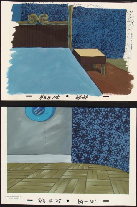 These are 2 original hand-painted backgrounds from the Nickelodeon television show SpongeBob Squarepants. The story takes place under the deep blue sea in Bikini Bottom, where SpongeBob resides. SpongeBob, who is a yellow, porous sponge, is your typical happy-go-lucky character, as he is always cheerful and enjoys making people laugh. His best friend and neighbor is Patrick Star, a starfish who boasts knowing nothing and is often getting himself into ridiculous situations. Between the homes of these two lies the home of the miserable Squidward, a squid, who is known for being grouchy and playing tricks on SpongeBob and Patrick. Both SpongeBob and Squidward work at the Krusty Krab, a fast food business run by the greedy money-loving Mr. Krabs, a crab, the arch rival of the evil, possibly misunderstood, Plankton. Another neighbor, Sandy Cheeks, an athletic squirrel who normally wears an astronaut's space suit, was introduced in "Tea at the Treedome." She spends most of her time inventing and experimenting. These backgrounds are interiors of Squidward's bedroom showing part of his bed, and a close-up of the door.Original Production Background on paper, with peg holes Sizes of sheets: 10 1/4 x 14 inchesVery good condition; have been stored rolledOriginal Production Backgrounds are used in the making of the final version of animated productions. The background establishes the location and the overall good mood of the scene. Typically, a background layout artist creates a drawing to establish the content of the scene, placement of characters, perspective and camera angle. Based on this drawing, the background artist creates a preliminary painting to confirm all of the scenes details, then the final production background which is used in the filming of the scene. When these backgrounds are individually photographed behind the progression of production cels, and projected at a rapid succession, the images in the foreground appear to move, creating an animated scene. The backgrounds are ready to be matted and framed. They include animator's notations at the lower edge, and one has a 2003 Viacom stamp on the lower left. One has a clear sheet of acetate taped to the bottom edge.