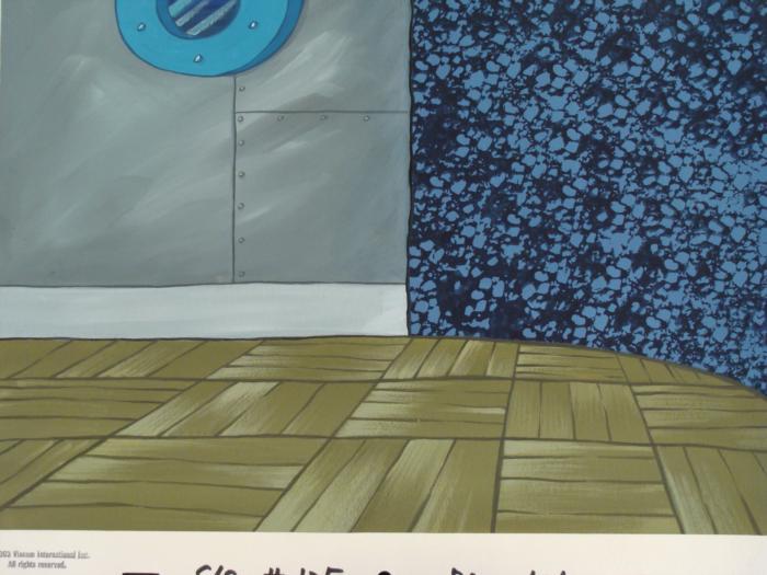 These are 2 original hand-painted backgrounds from the Nickelodeon television show SpongeBob Squarepants. The story takes place under the deep blue sea in Bikini Bottom, where SpongeBob resides. SpongeBob, who is a yellow, porous sponge, is your typical happy-go-lucky character, as he is always cheerful and enjoys making people laugh. His best friend and neighbor is Patrick Star, a starfish who boasts knowing nothing and is often getting himself into ridiculous situations. Between the homes of these two lies the home of the miserable Squidward, a squid, who is known for being grouchy and playing tricks on SpongeBob and Patrick. Both SpongeBob and Squidward work at the Krusty Krab, a fast food business run by the greedy money-loving Mr. Krabs, a crab, the arch rival of the evil, possibly misunderstood, Plankton. Another neighbor, Sandy Cheeks, an athletic squirrel who normally wears an astronaut's space suit, was introduced in "Tea at the Treedome." She spends most of her time inventing and experimenting. These backgrounds are interiors of Squidward's bedroom showing part of his bed, and a close-up of the door.Original Production Background on paper, with peg holes Sizes of sheets: 10 1/4 x 14 inchesVery good condition; have been stored rolledOriginal Production Backgrounds are used in the making of the final version of animated productions. The background establishes the location and the overall good mood of the scene. Typically, a background layout artist creates a drawing to establish the content of the scene, placement of characters, perspective and camera angle. Based on this drawing, the background artist creates a preliminary painting to confirm all of the scenes details, then the final production background which is used in the filming of the scene. When these backgrounds are individually photographed behind the progression of production cels, and projected at a rapid succession, the images in the foreground appear to move, creating an animated scene. The backgrounds are ready to be matted and framed. They include animator's notations at the lower edge, and one has a 2003 Viacom stamp on the lower left. One has a clear sheet of acetate taped to the bottom edge.