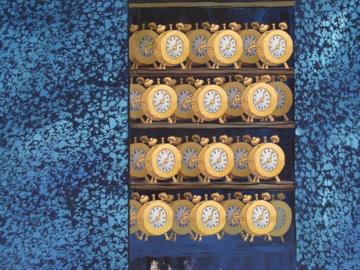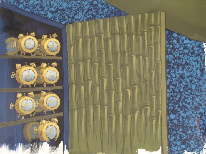 These are 2 original hand-painted backgrounds from the Nickelodeon television show SpongeBob Squarepants. The story takes place under the deep blue sea in Bikini Bottom, where SpongeBob resides. SpongeBob, who is a yellow, porous sponge, is your typical happy-go-lucky character, as he is always cheerful and enjoys making people laugh. His best friend and neighbor is Patrick Star, a starfish who boasts knowing nothing and is often getting himself into ridiculous situations. Between the homes of these two lies the home of the miserable Squidward, a squid, who is known for being grouchy and playing tricks on SpongeBob and Patrick. Both SpongeBob and Squidward work at the Krusty Krab, a fast food business run by the greedy money-loving Mr. Krabs, a crab, the arch rival of the evil, possibly misunderstood, Plankton. Another neighbor, Sandy Cheeks, an athletic squirrel who normally wears an astronaut's space suit, was introduced in "Tea at the Treedome." She spends most of her time inventing and experimenting. These show Squidward's collection of trusty alarm clocks. Original Production Background on paper, with peg holes; note- the one showing the most clocks actually is only partly hand painted. The shelves and clocks image is from a printed copy that has been pasted onto a painted backgroundSizes of sheets: 10 1/8 x 14 inchesVery good condition, with slight wear near the edges; have been stored rolledOriginal Production Backgrounds are used in the making of the final version of animated productions. The background establishes the location and the overall good mood of the scene. Typically, a background layout artist creates a drawing to establish the content of the scene, placement of characters, perspective and camera angle. Based on this drawing, the background artist creates a preliminary painting to confirm all of the scenes details, then the final production background which is used in the filming of the scene. When these backgrounds are individually photographed behind the progression of production cels, and projected at a rapid succession, the images in the foreground appear to move, creating an animated scene. The backgrounds are ready to be matted and framed. They include animator's notations at the lower edge. One has a 2003 Viacom stamp on the lower left, and the other has a clear sheet of acetate taped to the bottom edge.