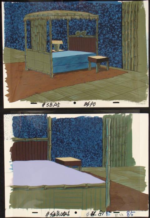 These are 2 original hand-painted backgrounds from the Nickelodeon television show SpongeBob Squarepants. The story takes place under the deep blue sea in Bikini Bottom, where SpongeBob resides. SpongeBob, who is a yellow, porous sponge, is your typical happy-go-lucky character, as he is always cheerful and enjoys making people laugh. His best friend and neighbor is Patrick Star, a starfish who boasts knowing nothing and is often getting himself into ridiculous situations. Between the homes of these two lies the home of the miserable Squidward, a squid, who is known for being grouchy and playing tricks on SpongeBob and Patrick. Both SpongeBob and Squidward work at the Krusty Krab, a fast food business run by the greedy money-loving Mr. Krabs, a crab, the arch rival of the evil, possibly misunderstood, Plankton. Another neighbor, Sandy Cheeks, an athletic squirrel who normally wears an astronaut's space suit, was introduced in "Tea at the Treedome." She spends most of her time inventing and experimenting. These backgrounds are interiors of Squidward's bedroom. One shows his bed, and the other has a close-up of his bed with the covers on.Original Production Background on paper, with peg holes, including one with cel overlay Sizes of sheets: 10 1/4 x 14 inchesVery good condition; have been stored rolledOriginal Production Backgrounds are used in the making of the final version of animated productions. The background establishes the location and the overall good mood of the scene. Typically, a background layout artist creates a drawing to establish the content of the scene, placement of characters, perspective and camera angle. Based on this drawing, the background artist creates a preliminary painting to confirm all of the scenes details, then the final production background which is used in the filming of the scene. When these backgrounds are individually photographed behind the progression of production cels, and projected at a rapid succession, the images in the foreground appear to move, creating an animated scene. The backgrounds are ready to be matted and framed. They include animator's notations at the lower edge. Both have cels taped to the bottom edge- one just clear, and the other with hand painted details of his lilac colored covers.