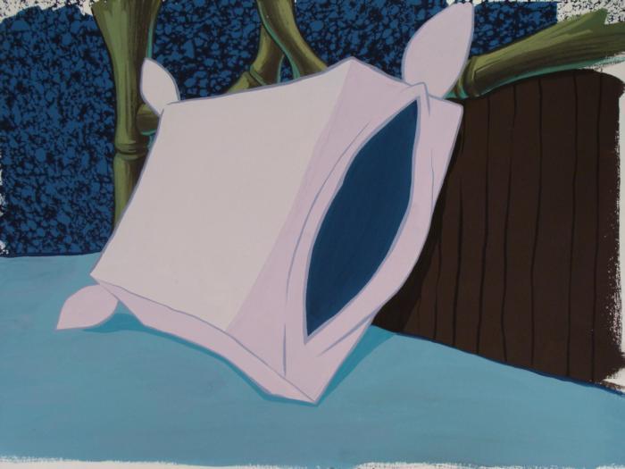 These are 2 original hand-painted backgrounds from the Nickelodeon television show SpongeBob Squarepants. The story takes place under the deep blue sea in Bikini Bottom, where SpongeBob resides. SpongeBob, who is a yellow, porous sponge, is your typical happy-go-lucky character, as he is always cheerful and enjoys making people laugh. His best friend and neighbor is Patrick Star, a starfish who boasts knowing nothing and is often getting himself into ridiculous situations. Between the homes of these two lies the home of the miserable Squidward, a squid, who is known for being grouchy and playing tricks on SpongeBob and Patrick. Both SpongeBob and Squidward work at the Krusty Krab, a fast food business run by the greedy money-loving Mr. Krabs, a crab, the arch rival of the evil, possibly misunderstood, Plankton. Another neighbor, Sandy Cheeks, an athletic squirrel who normally wears an astronaut's space suit, was introduced in "Tea at the Treedome." She spends most of her time inventing and experimenting. These backgrounds are interiors of Squidward's bedroom. One shows his pillow, and the other has a very unusual view of his alarm clock from inside his pillow.Original Production Background on paper, with peg holes Sizes of sheets: 10 1/4 x 14 inchesVery good condition; have been stored rolledOriginal Production Backgrounds are used in the making of the final version of animated productions. The background establishes the location and the overall good mood of the scene. Typically, a background layout artist creates a drawing to establish the content of the scene, placement of characters, perspective and camera angle. Based on this drawing, the background artist creates a preliminary painting to confirm all of the scenes details, then the final production background which is used in the filming of the scene. When these backgrounds are individually photographed behind the progression of production cels, and projected at a rapid succession, the images in the foreground appear to move, creating an animated scene. The backgrounds are ready to be matted and framed. They include animator's notations at the lower edge, and one has a clear sheet of acetate taped to the bottom edge.