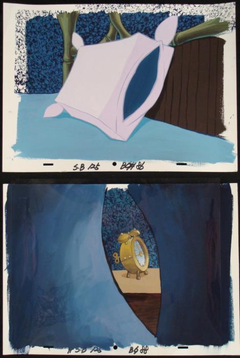 These are 2 original hand-painted backgrounds from the Nickelodeon television show SpongeBob Squarepants. The story takes place under the deep blue sea in Bikini Bottom, where SpongeBob resides. SpongeBob, who is a yellow, porous sponge, is your typical happy-go-lucky character, as he is always cheerful and enjoys making people laugh. His best friend and neighbor is Patrick Star, a starfish who boasts knowing nothing and is often getting himself into ridiculous situations. Between the homes of these two lies the home of the miserable Squidward, a squid, who is known for being grouchy and playing tricks on SpongeBob and Patrick. Both SpongeBob and Squidward work at the Krusty Krab, a fast food business run by the greedy money-loving Mr. Krabs, a crab, the arch rival of the evil, possibly misunderstood, Plankton. Another neighbor, Sandy Cheeks, an athletic squirrel who normally wears an astronaut's space suit, was introduced in "Tea at the Treedome." She spends most of her time inventing and experimenting. These backgrounds are interiors of Squidward's bedroom. One shows his pillow, and the other has a very unusual view of his alarm clock from inside his pillow.Original Production Background on paper, with peg holes Sizes of sheets: 10 1/4 x 14 inchesVery good condition; have been stored rolledOriginal Production Backgrounds are used in the making of the final version of animated productions. The background establishes the location and the overall good mood of the scene. Typically, a background layout artist creates a drawing to establish the content of the scene, placement of characters, perspective and camera angle. Based on this drawing, the background artist creates a preliminary painting to confirm all of the scenes details, then the final production background which is used in the filming of the scene. When these backgrounds are individually photographed behind the progression of production cels, and projected at a rapid succession, the images in the foreground appear to move, creating an animated scene. The backgrounds are ready to be matted and framed. They include animator's notations at the lower edge, and one has a clear sheet of acetate taped to the bottom edge.