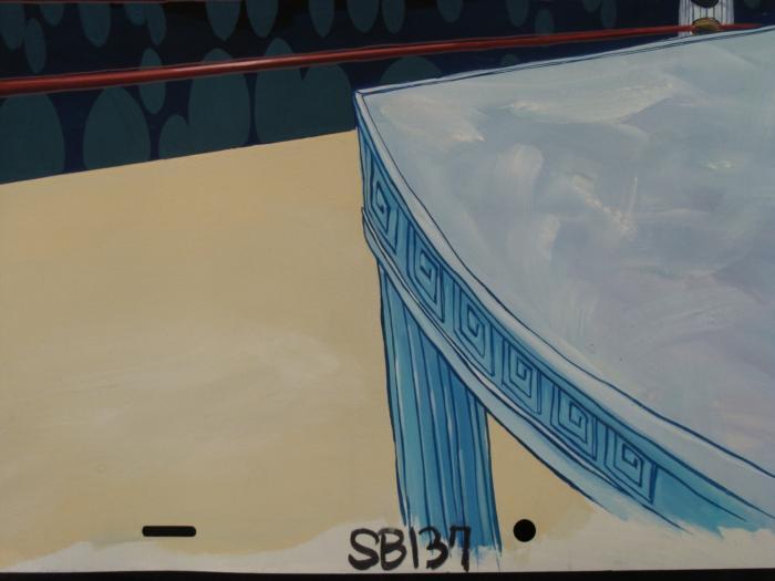 These original hand-painted backgrounds are from the Nickelodeon TV show SpongeBob Squarepants. The story takes place under the deep blue sea in Bikini Bottom, where SpongeBob resides. SpongeBob, who is a yellow, porous sponge, is your typical happy-go-lucky character, as he is always cheerful and enjoys making people laugh. Patrick Star, SpongeBob's neighbor who is a starfish, is your average children's show idiot, as he boasts knowing nothing and is often getting himself into ridiculous situations. Between the homes of these two lies the home of the miserable Squidward, a squid, who is known for being grouchy and playing tricks on SpongeBob and Patrick. Both SpongeBob and Squidward work at the Krusty Krab, a fast food business run by the greedy money-loving Mr. Krabs, a crab, the arch rival of the evil, possibly misunderstood, Plankton. Another neighbor, Sandy Cheeks, an athletic squirrel who normally wears an astronaut's space suit, was introduced in "Tea at the Treedome." She spends most of her time inventing and experimenting. These backgrounds appear to be of a some wrestling rink with a long table in the middle. Original Production Background 0+6Overall Size of Background: 10 1/2" x 26" Very good condition; it has been stored rolledOriginal Production Backgrounds are used in the making of the final version of animated productions. The background establishes the location and the overall good mood of the scenee. Typically, a background layout artist creates a drawing to establish the content of the scene, placement of characters, perspective and camera angle. Based on this drawing, the background artist creates a preliminary painting to confirm all of the scenes details, then the final production background which is used in the filming of the scene. When these backgrounds are individually photographed behind the progression of production cels, and projected at a rapid succession, the images in the foreground appear to move, creating an animated scene. The background is ready to be matted and framed. It is a colored background with the animator's notations at the bottom.