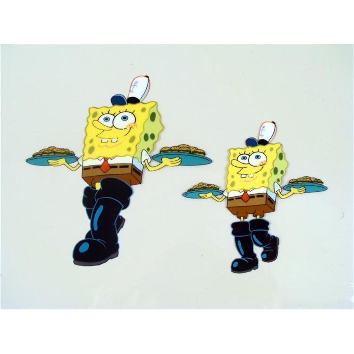 These two original hand-painted animation cels are from the Nickelodeon TVs how SpongeBob Squarepants. The story takes place under the deep blue sea in Bikini Bottom, where SpongeBob resides. SpongeBob, who is a yellow, porous sponge, is your typical happy-go-lucky character, as he is always cheerful and enjoys making people laugh. Patrick Star, SpongeBob's neighbor who is a starfish, boasts knowing nothing and is often getting himself into ridiculous situations. Between the homes of these two lies the home of the miserable Squidward, a squid, who is known for being grouchy and playing tricks on SpongeBob and Patrick. Both SpongeBob and Squidward work at the Krusty Krab, a fast food business run by the greedy money-loving Mr. Krabs, a crab, the arch rival of the evil, possibly misunderstood, Plankton. Another neighbor, Sandy Cheeks, an athletic squirrel who normally wears an astronaut's space suit, was introduced in "Tea at the Treedome." She spends most of her time inventing and experimenting.SpongeBob is walking forward with two big trays of Krabby Patties. * * Original Production Background Overall Size of cel10 1/2" x 12 1/2" Very good conditionOriginal Production Backgrounds are used in the making of the final version of animated productions. Each one-of-a-kind set-up represents a slight change in position of the characters. When individually photographed and projected in rapid succession, the images appear to move.To create production cels, the original animator's drawing is transferred onto an acetate cel (by hand-inking and/or photo copying). The cel is then hand-painted on the reverse side. * The bottom of the sheet has peg holes, and the animator's notations. *