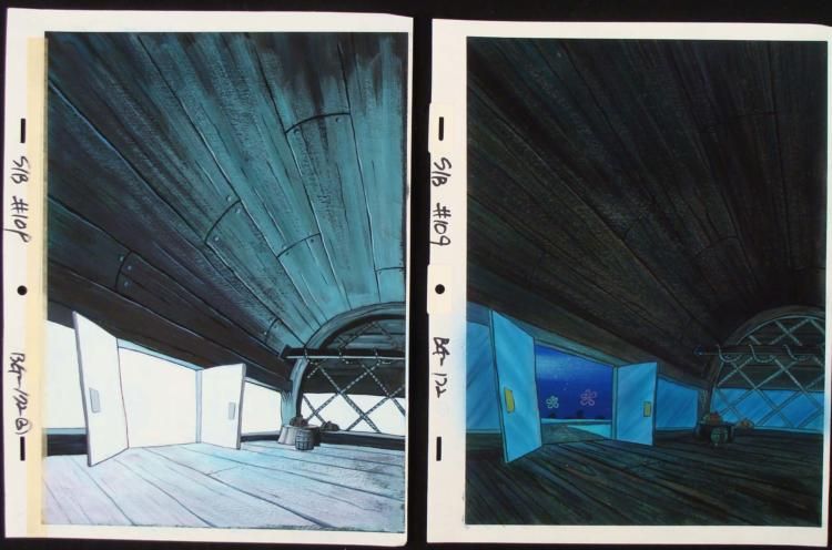 Normal 0 false false false MicrosoftInternetExplorer4 /* Style Definitions */ table.MsoNormalTable{mso-style-name:"Table Normal";mso-tstyle-rowband-size:0;mso-tstyle-colband-size:0;mso-style-noshow:yes;mso-style-parent:"";mso-padding-alt:0in 5.4pt 0in 5.4pt;mso-para-margin:0in;mso-para-margin-bottom:.0001pt;mso-pagination:widow-orphan;font-size:10.0pt;font-family:"Times New Roman";mso-ansi-language:#0400;mso-fareast-language:#0400;mso-bidi-language:#0400;}These original hand-painted backgrounds are from the Nickelodeon TV show SpongeBob Squarepants. The story takes place under the deep blue sea in Bikini Bottom, where SpongeBob resides. SpongeBob, who is a yellow, porous sponge, is your typical happy-go-lucky character, as he is always cheerful and enjoys making people laugh. Patrick Star, SpongeBob's neighbor who is a starfish, boasts knowing nothing and is often getting himself into ridiculous situations. Between the homes of these two lies the home of the miserable Squidward, a squid, who is known for being grouchy and playing tricks on SpongeBob and Patrick. Both SpongeBob and Squidward work at the Krusty Krab, a fast food business run by the greedy money-loving Mr. Krabs, a crab, the arch rival of the evil, possibly misunderstood, Plankton. Another neighbor, Sandy Cheeks, an athletic squirrel who normally wears an astronaut's space suit, was introduced in "Tea at the Treedome." She spends most of her time inventing and experimenting. * Offered here are two backgrounds from the same scene of the Halloween episode. One is color, and the other mostly white. These were probably used for a lightning effect, by quickly flashing the white scene along with the color. * * Original Production Background Overall Size of Backgrounds: 10 1/4" x 13 3/8" Very good condition; it has been stored Original Production Backgrounds are used in the making of the final version of animated productions. The background establishes the location and the overall good mood of the scene. Typically, a background layout artist creates a drawing to establish the content of the scene, placement of characters, perspective and camera angle. Based on this drawing, the background artist creates a preliminary painting to confirm all of the scenes details, then the final production background which is used in the filming of the scene. When these backgrounds are individually photographed behind the progression of production cels, and projected at a rapid succession, the images in the foreground appear to move, creating an animated scene. * The background is ready to be matted and framed. It is a colored background with the animator's notations are taped on the left side of both backgrounds. *