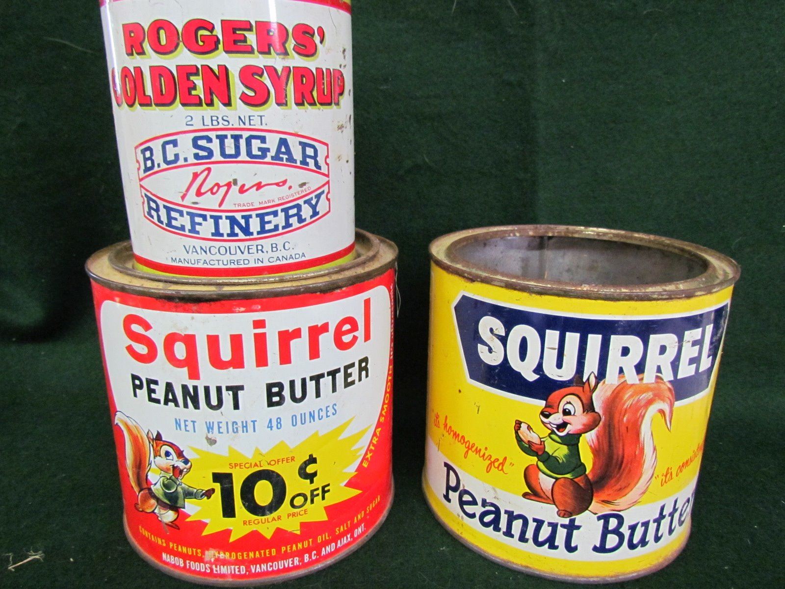 2 Squirrel peanut butter, Roger's Golden Syrup tins