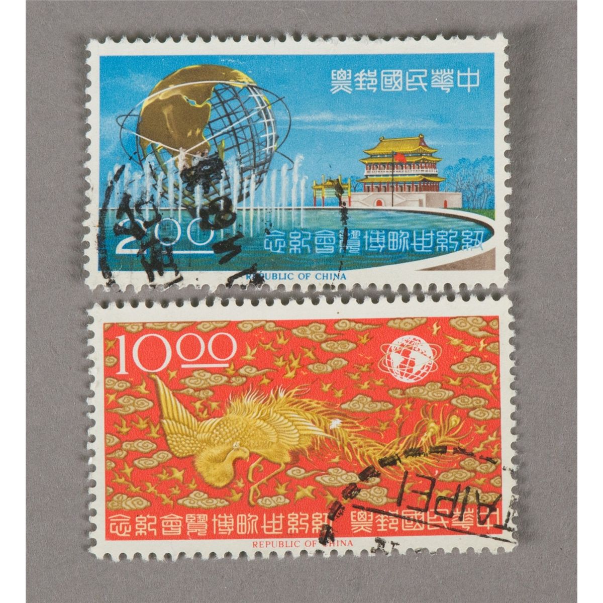 Two "2 Yuan" & "10 Yuan" Taiwanese stamps, Commemorative 97 New York World’s Fair 1964-1965 Commemorative Issue (1964); 48.2 mm x 29 mm