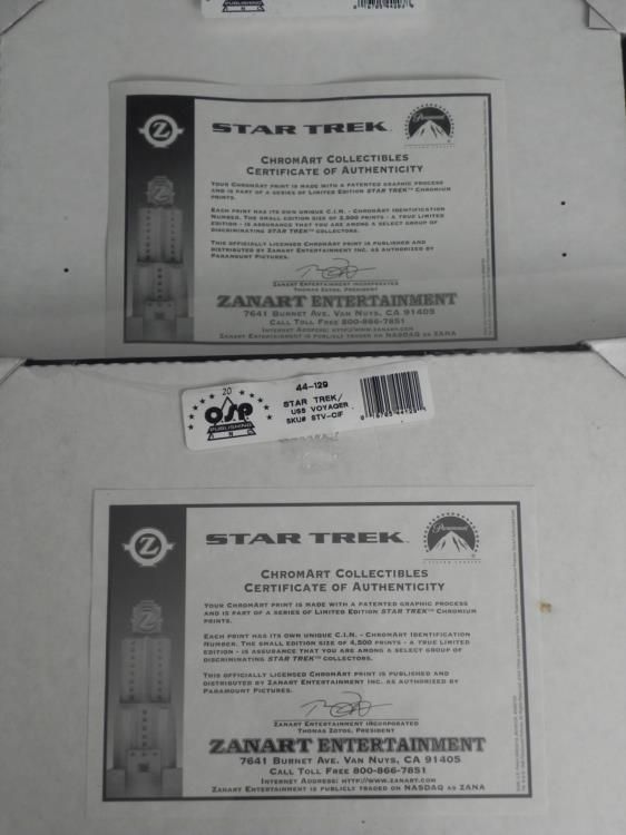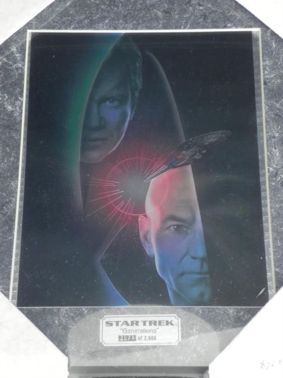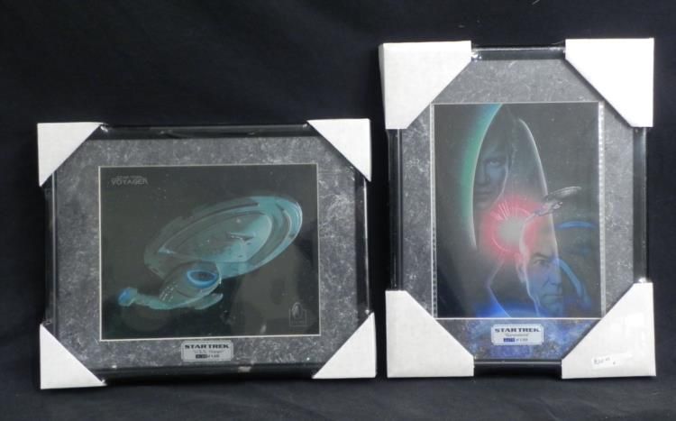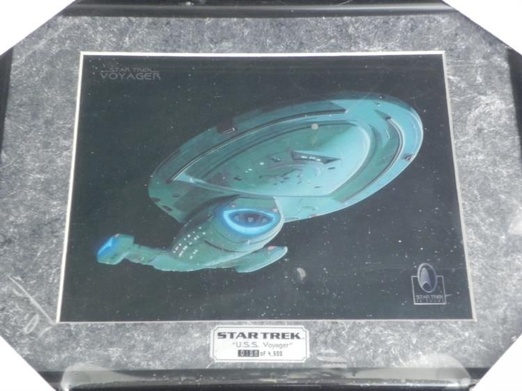 Here are two limited edition Star Trek framed prints, each with a metallic surface, giving it a stellar appearance. One is the U.S.S. Voyager, and the other is a collage image from Generations. Titles: U.S.S. Voyager; Generations Medium: ChromArt chromium print Publisher: O.S.P. Edition: Limited, numbered Framing: Matted in gray marbled matte, in black laminate frame Frame size: 14 x 11 inches Certificate of Authenticity: From Aznart Entertainment Condition: Mint, still sealed in shrink wrap